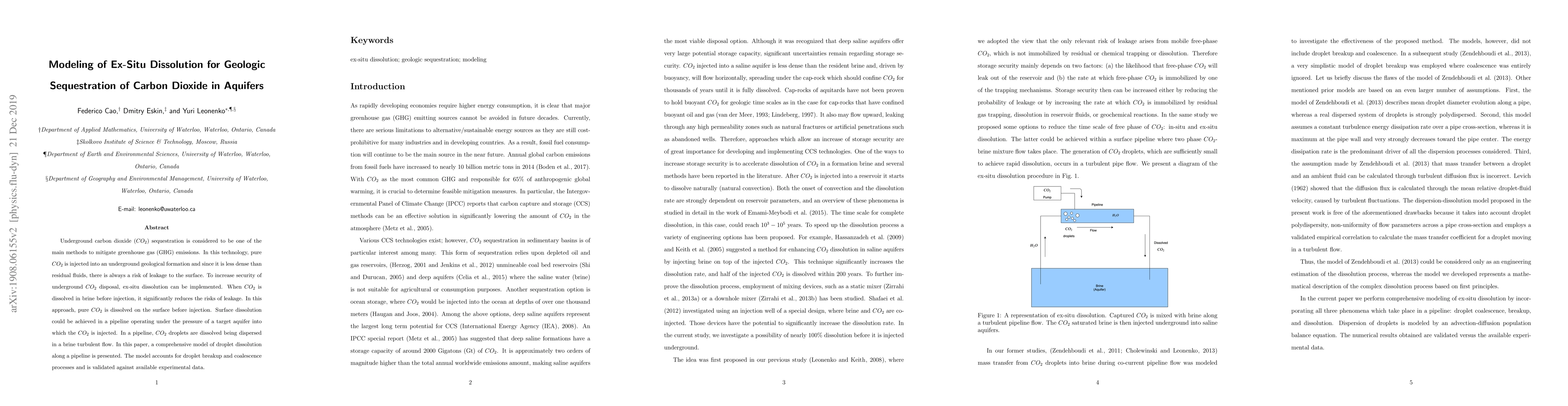 This paper presents a comprehensive model for ex-situ dissolution of $CO_2$ in brine before injection into aquifers to enhance the security of underground carbon sequestration, accounting for droplet breakup and coalescence, and validates it against experimental data. The model aims to mitigate leakage risks by dissolving $CO_2$ in a pipeline before injection.