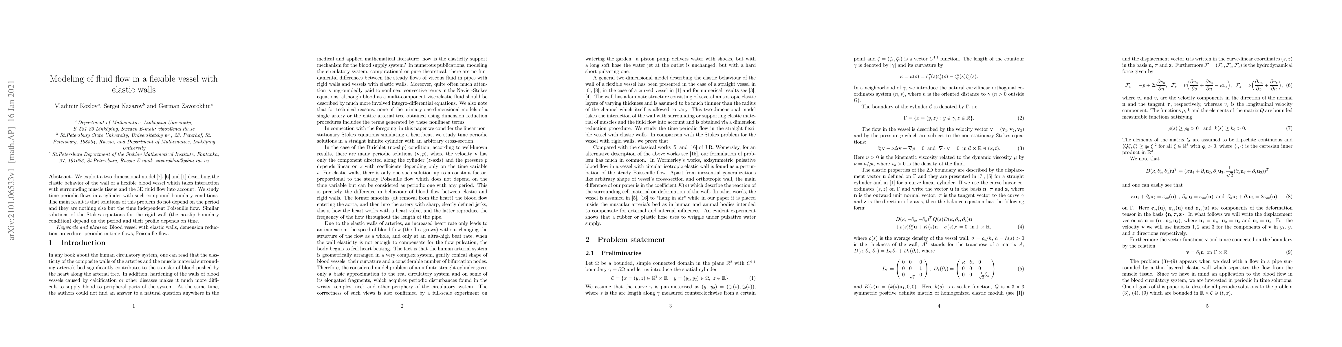 This paper models fluid flow in a flexible blood vessel with elastic walls, considering the vessel's interaction with surrounding tissue and three-dimensional fluid dynamics. The study reveals that time-periodic flows in such vessels result in time-independent Poiseuille flow, contrasting with rigid-walled vessels where flow profiles vary with time.