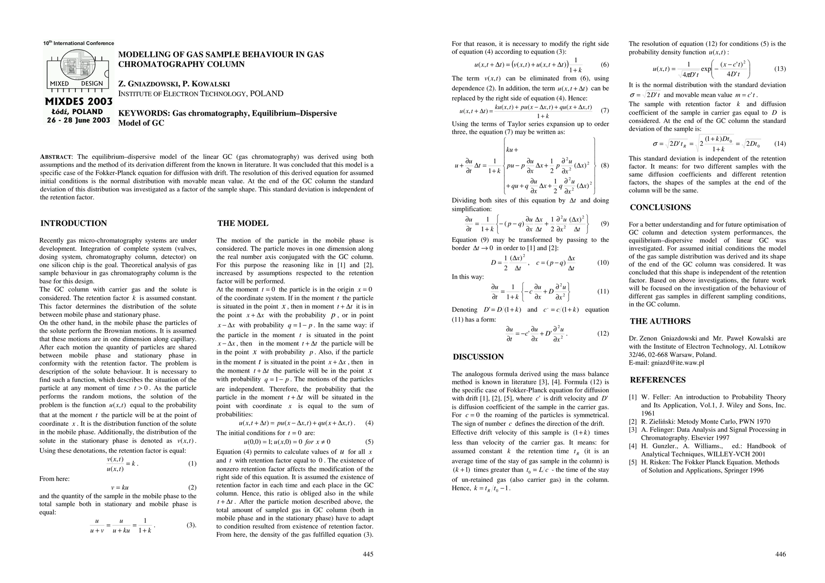 The equilibrium-dispersive model of the linear GC (gas chromatography) was derived using both assumptions and the method of its derivation different from the known in literature. It was concluded that this model is a specific case of the Fokker-Planck equation for diffusion with drift. The resolution of this derived equation for assumed initial conditions is the normal distribution with movable mean value. At the end of the GC column the standard deviation of this distribution was investigated as a factor of the sample shape. This standard deviation is independent of the retention factor.