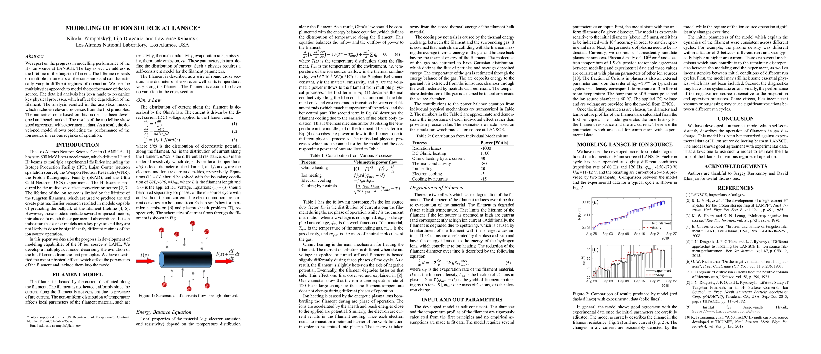 We report on the progress in modelling performance of the H- ion source at LANSCE. The key aspect we address is the lifetime of the tungsten filament. The lifetime depends on multiple parameters of the ion source and can dramatically vary in different regimes of operation. We use the multiphysics approach to model the performance of the ion source. The detailed analysis has been made to recognize key physical processes, which affect the degradation of the filament. The analysis resulted in the analytical model, which includes relevant processes from the first principles. The numerical code based on this model has been developed and benchmarked. The results of the modelling show good agreement with experimental data. As a result, the developed model allows predicting the performance of the ion source in various regimes of operation.