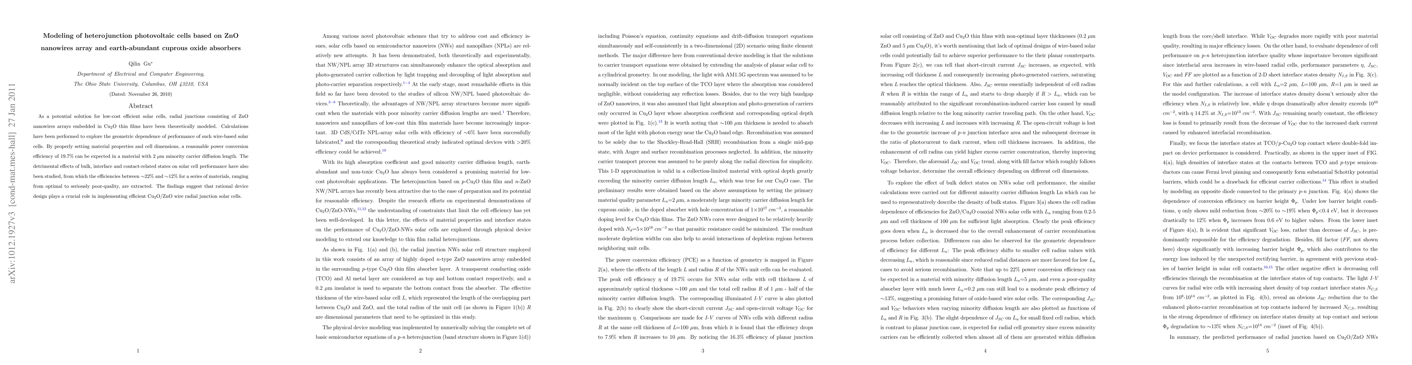 This paper models heterojunction photovoltaic cells using ZnO nanowire arrays embedded in Cu2O absorbers, aiming for low-cost, efficient solar cells. The study finds a theoretical power conversion efficiency of 19.7% with optimal material properties, highlighting the importance of device design in achieving high efficiency.