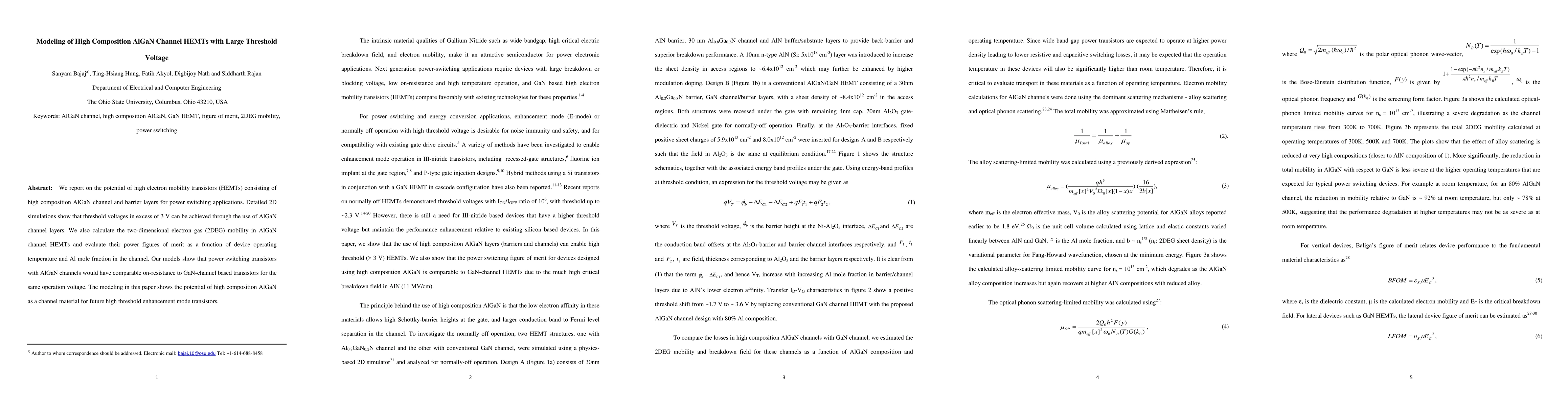 This paper models high composition AlGaN channel HEMTs, demonstrating that they can achieve threshold voltages over 3 V and comparable on-resistance to GaN-channel HEMTs, suggesting potential for future high threshold enhancement mode power transistors. The study evaluates 2DEG mobility and power figures of merit across varying temperatures and Al mole fractions.