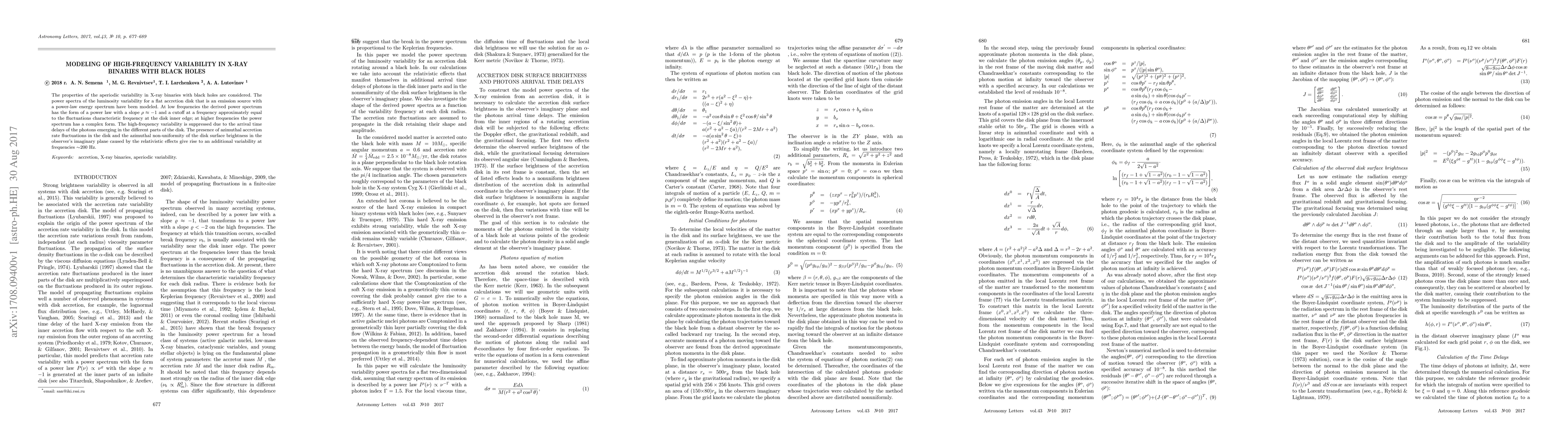The properties of the aperiodic variability in X-ray binaries with black holes are considered. The power spectra of the luminosity variability for a flat accretion disk that is an emission source with a power-law energy spectrum have been modeled. At low frequencies the derived power spectrum has the form of a power law with a slope $\rho\approx-1$ and a cutoff at a frequency approximately equal to the fluctuations characteristic frequency at the disk inner edge; at higher frequencies the power spectrum has a complex form. The high-frequency variability is suppressed due to the arrival time delays of the photons emerging in the different parts of the disk. The presence of azimuthal accretion rate fluctuations in the disk and the azimuthal non-uniformity of the disk surface brightness in the observer's imaginary plane caused by the relativistic effects give rise to an additional variability at frequencies $\sim$200 Hz.