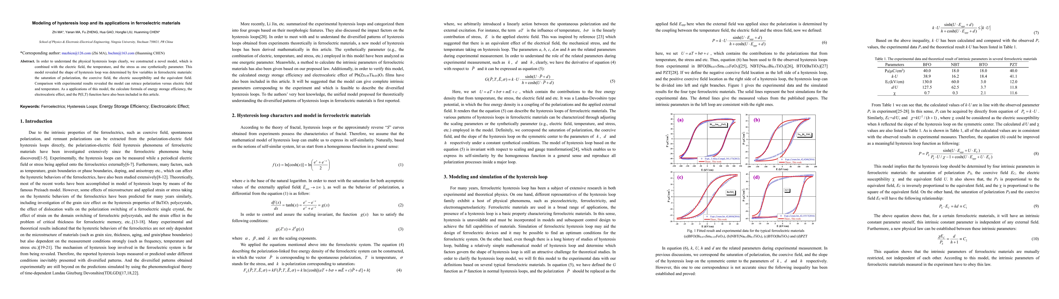 This paper introduces a novel model to understand hysteresis loops in ferroelectric materials, integrating electric field, temperature, and stress. The model accurately predicts the shape of hysteresis loops and matches experimental results, also providing calculations for energy storage efficiency, electrocaloric effect, and P(E,T) function.