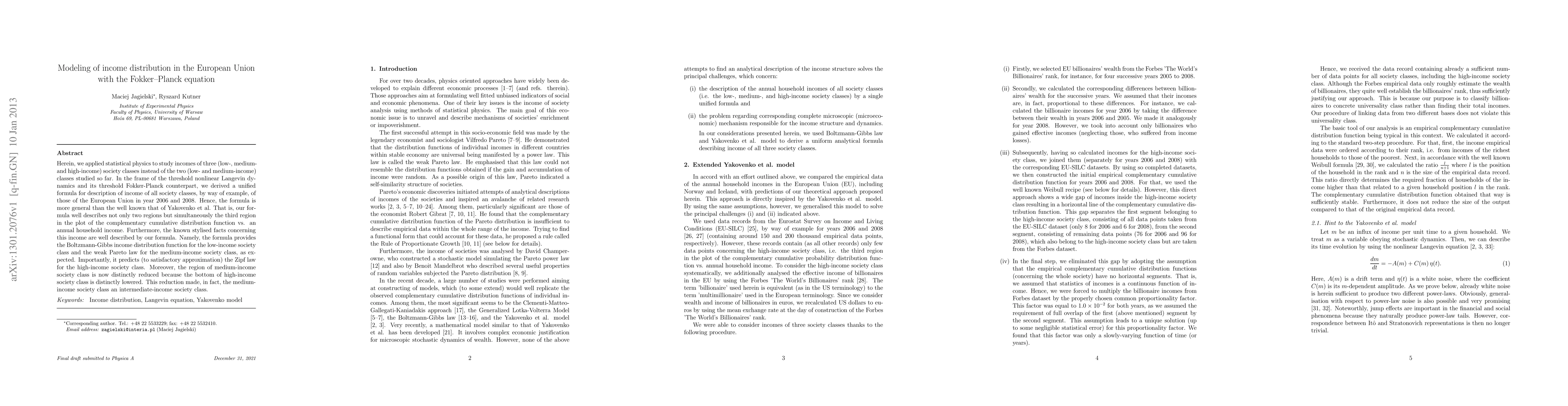 This paper applies statistical physics to model income distribution across three societal classes in the European Union using the Fokker-Planck equation. It derives a more general formula than previous models, accurately describing income distributions for low, medium, and high-income classes, and predicting the Zipf law for high-income earners.