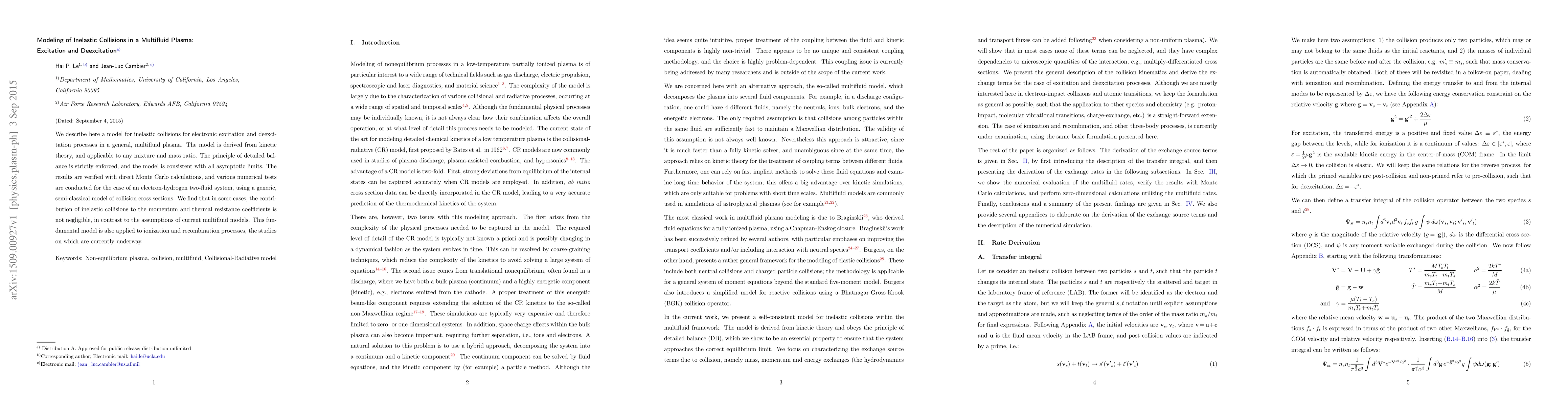 We describe here a model for inelastic collisions for electronic excitation and deexcitation processes in a general, multifluid plasma. The model is derived from kinetic theory, and applicable to any mixture and mass ratio. The principle of detailed balance is strictly enforced, and the model is consistent with all asymptotic limits. The results are verified with direct Monte Carlo calculations, and various numerical tests are conducted for the case of an electron-hydrogen two-fluid system, using a generic, semi-classical model of collision cross sections. We find that in some cases, the contribution of inelastic collisions to the momentum and thermal resistance coefficients is not negligible, in contrast to the assumptions of current multifluid models. This fundamental model is also applied to ionization and recombination processes, the studies on which are currently underway.