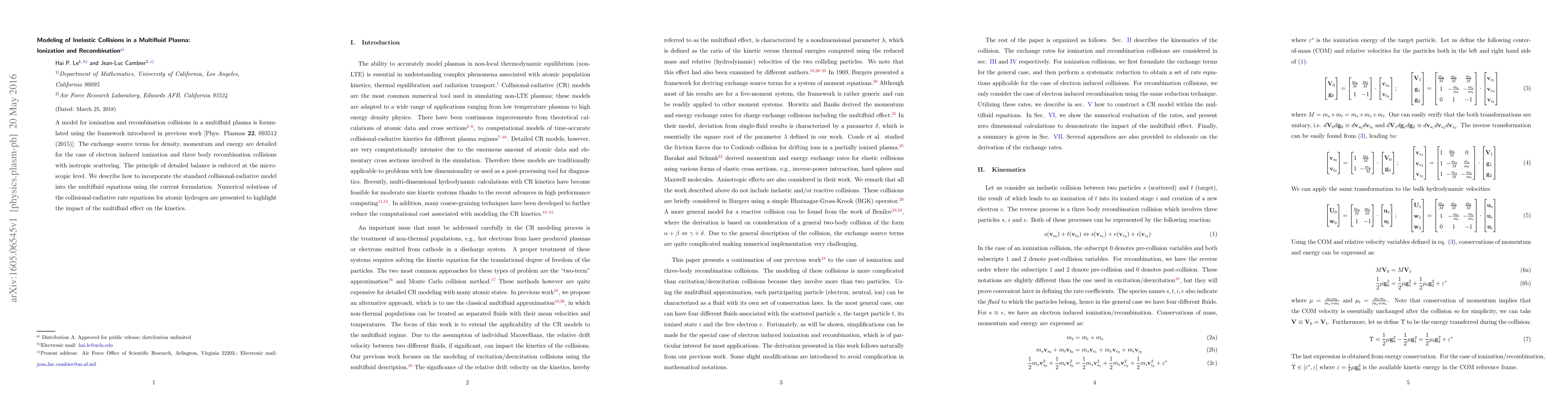 This paper formulates a model for ionization and recombination in multifluid plasmas, detailing exchange source terms for density, momentum, and energy for electron-induced ionization and three-body recombination. It incorporates the standard collisional-radiative model into multifluid equations and presents numerical solutions for atomic hydrogen to demonstrate the multifluid effect on kinetics.