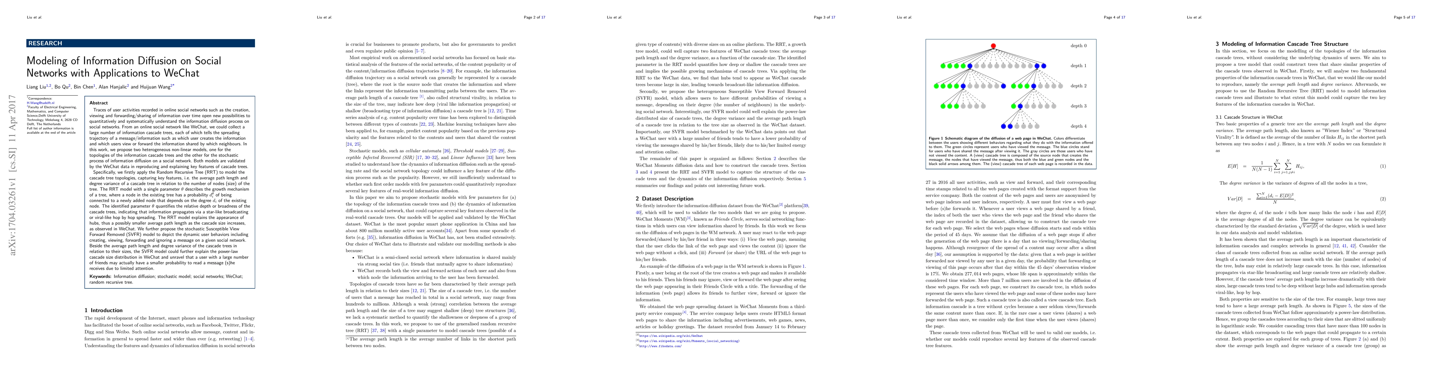 This paper proposes two heterogeneous non-linear models to understand information diffusion on social networks, specifically WeChat. The Random Recursive Tree (RRT) models cascade tree topologies, explaining features like average path length and degree variance. The Susceptible View Forward Removed (SVFR) model captures dynamic user behaviors in the diffusion process.