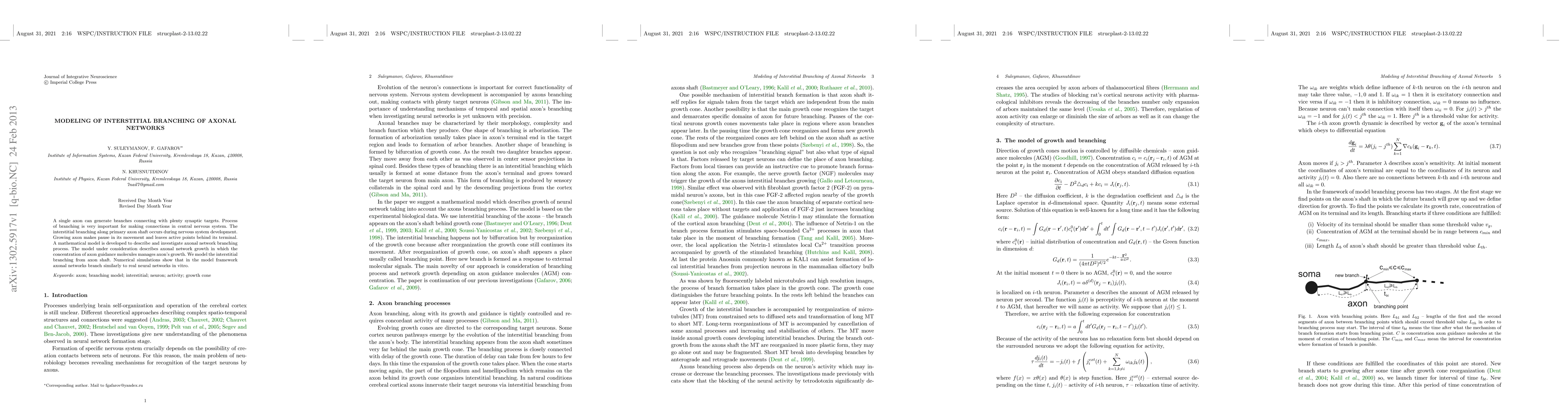 A single axon can generate branches connecting with plenty synaptic targets. Process of branching is very important for making connections in central nervous system. The interstitial branching along primary axon shaft occurs during nervous system development. Growing axon makes pause in its movement and leaves active points behind its terminal. The new branches appear from these points. We suggest mathematical model to describe and investigate neural network branching process. The model under consideration describes neural network growth in which the concentration of axon guidance molecules manages axon's growth. We model the interstitial branching from axon shaft. Numerical simulations show that in the model framework axonal networks are similar to neural network.