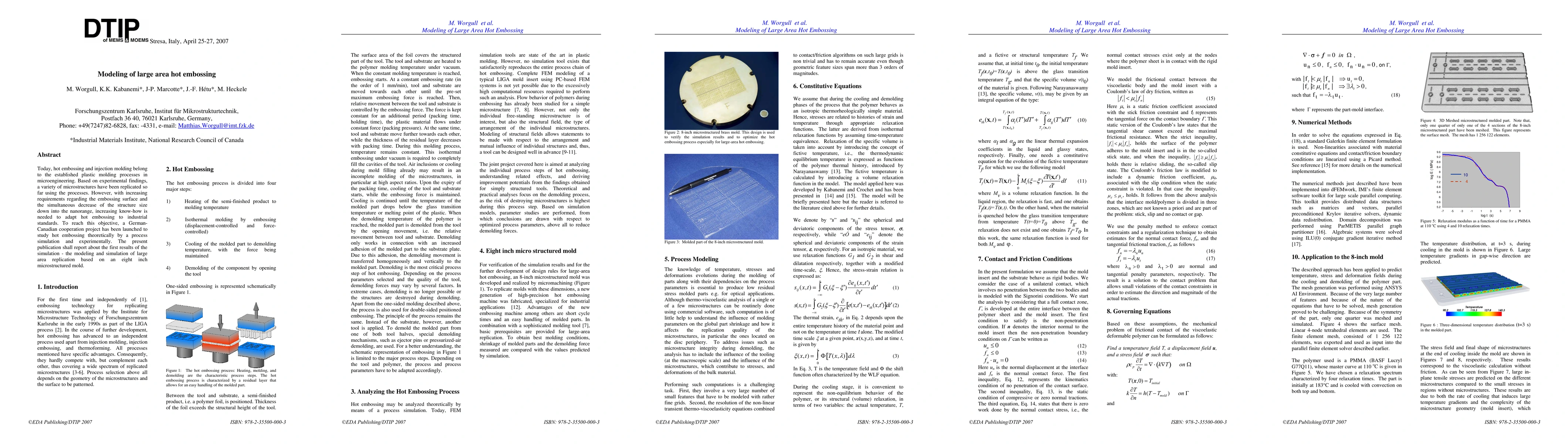 This paper reports on the initial results of a German-Canadian project aimed at adapting hot embossing for industrial standards through theoretical modeling and experimental validation. The study focuses on the simulation of large area replication using an eight-inch microstructured mold.
