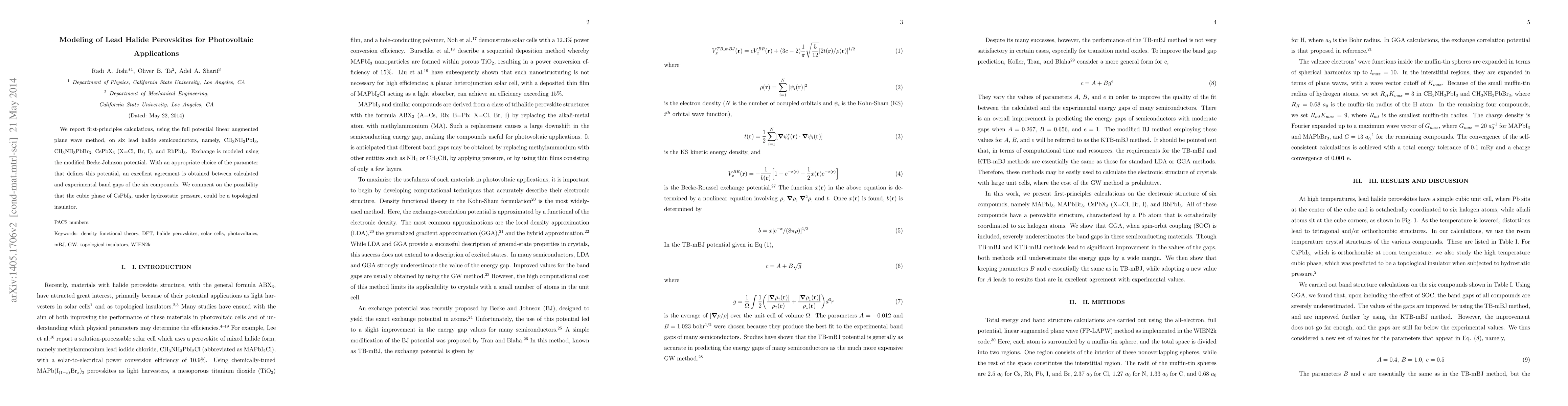 We report first-principles calculations, using the full potential linear augmented plane wave method, on six lead halide semiconductors, namely, CH3NH3PbI3, CH3NH3PbBr3, CsPbX3 (X=Cl, Br, I), and RbPbI3. Exchange is modeled using the modified Becke-Johnson potential. With an appropriate choice of the parameter that defines this potential, an excellent agreement is obtained between calculated and experimental band gaps of the six compounds. We comment on the possibility that the cubic phase of CsPbI3, under hydrostatic pressure, could be a topological insulator.