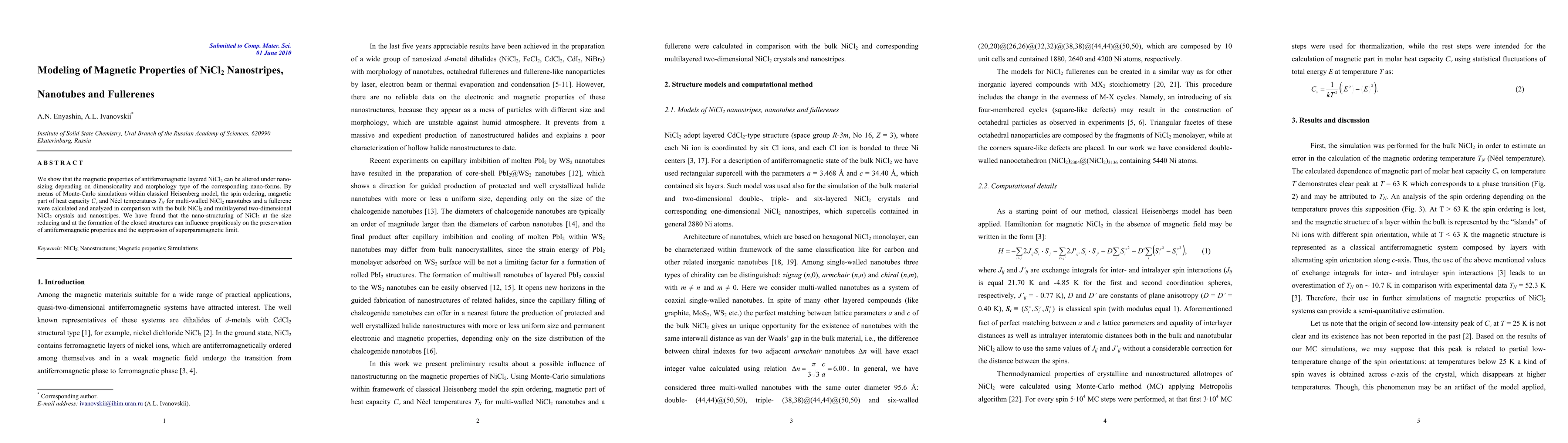 We show that the magnetic properties of antiferromagnetic layered NiCl$_{2}$ can be altered under nano-sizing depending on dimensionality and morphology type of the corresponding nano-forms. By means of Monte-Carlo simulations within classical Heisenberg model, the spin ordering, magnetic part of heat capacity C$_{v}$ and N\'eel temperatures T$_{N}$ for multi-walled NiCl$_{2}$ nanotubes and a fullerene were calculated and analyzed in comparison with the bulk NiCl$_{2}$ and multilayered two-dimensional NiCl$_{2}$ crystals and nanostripes. We have found that the nano-structuring of NiCl$_{2}$ at the size reducing and at the formation of the closed structures can influence propitiously on the preservation of antiferromagnetic properties.