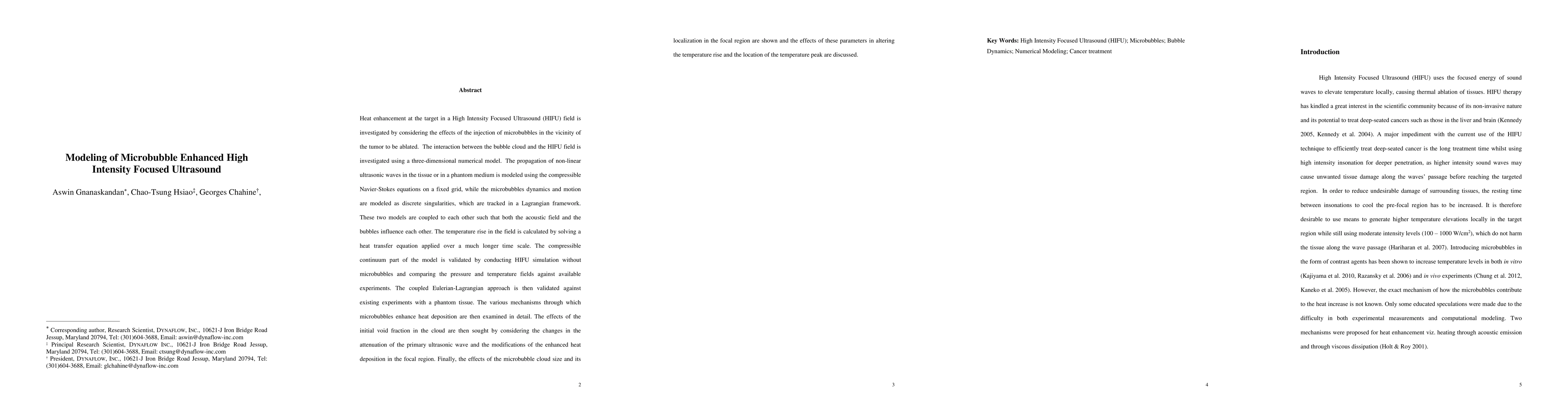 This paper models the interaction between microbubbles and High Intensity Focused Ultrasound (HIFU) to enhance heat deposition in targeted tumor ablation. A coupled Eulerian-Lagrangian approach is used to simulate the ultrasonic wave propagation and microbubble dynamics, validated against experimental data, and the effects of microbubble cloud parameters on heat enhancement are analyzed.
