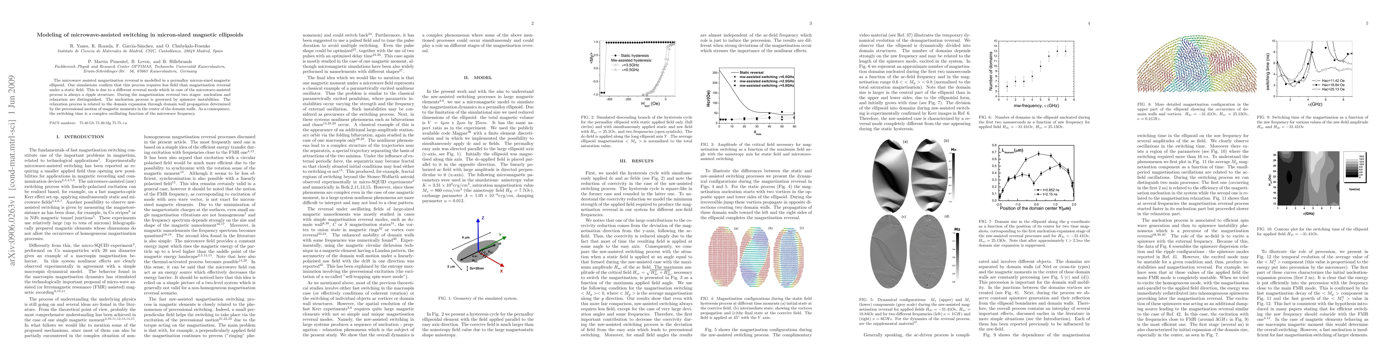 This paper models microwave-assisted magnetisation reversal in micron-sized permalloy ellipsoids, finding that it requires less field than static reversal due to a ripple structure reversal mode involving spinwave instabilities and domain wall propagation. The switching time is an oscillating function of microwave frequency.