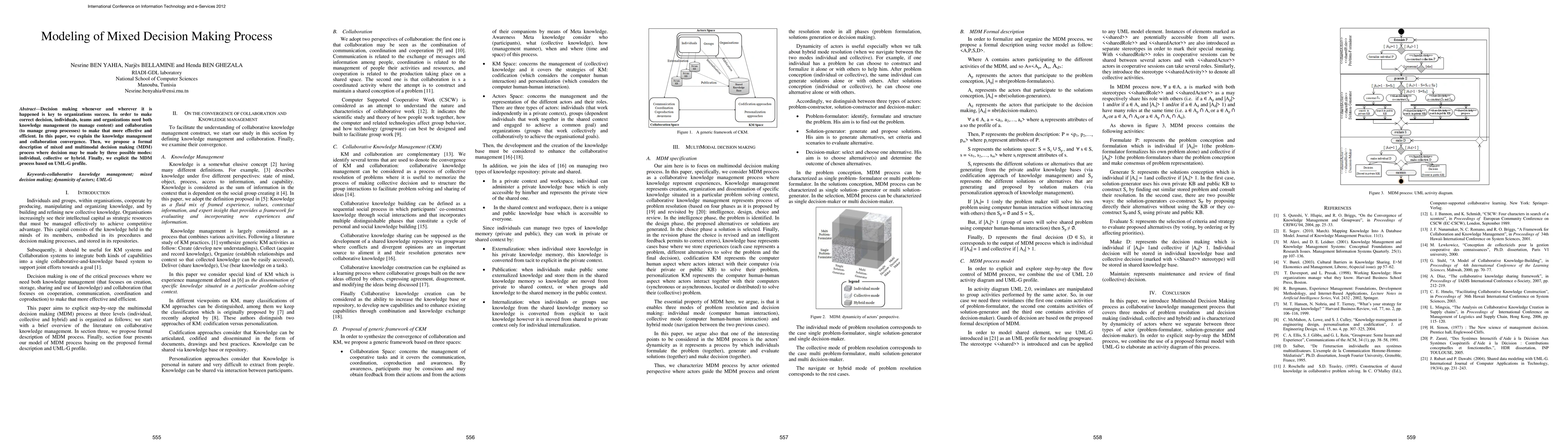 Decision making whenever and wherever it is happened is key to organizations success. In order to make correct decision, individuals, teams and organizations need both knowledge management (to manage content) and collaboration (to manage group processes) to make that more effective and efficient. In this paper, we explain the knowledge management and collaboration convergence. Then, we propose a formal description of mixed and multimodal decision making (MDM) process where decision may be made by three possible modes: individual, collective or hybrid. Finally, we explicit the MDM process based on UML-G profile.