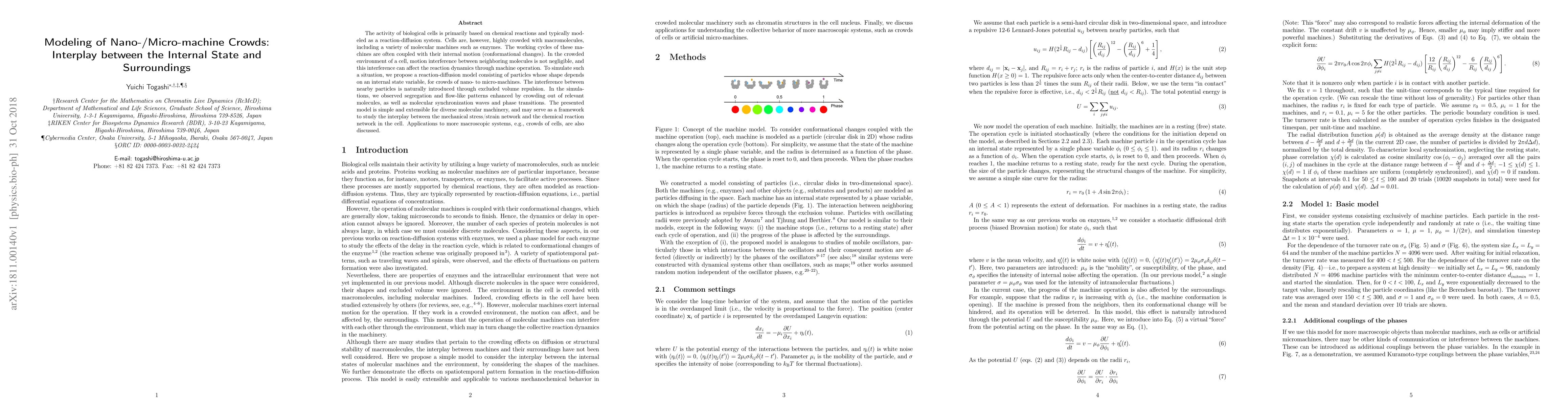 The activity of biological cells is primarily based on chemical reactions and typically modeled as a reaction-diffusion system. Cells are, however, highly crowded with macromolecules, including a variety of molecular machines such as enzymes. The working cycles of these machines are often coupled with their internal motion (conformational changes). In the crowded environment of a cell, motion interference between neighboring molecules is not negligible, and this interference can affect the reaction dynamics through machine operation. To simulate such a situation, we propose a reaction-diffusion model consisting of particles whose shape depends on an internal state variable, for crowds of nano- to micro-machines. The interference between nearby particles is naturally introduced through excluded volume repulsion. In the simulations, we observed segregation and flow-like patterns enhanced by crowding out of relevant molecules, as well as molecular synchronization waves and phase transitions. The presented model is simple and extensible for diverse molecular machinery, and may serve as a framework to study the interplay between the mechanical stress/strain network and the chemical reaction network in the cell. Applications to more macroscopic systems, e.g., crowds of cells, are also discussed.