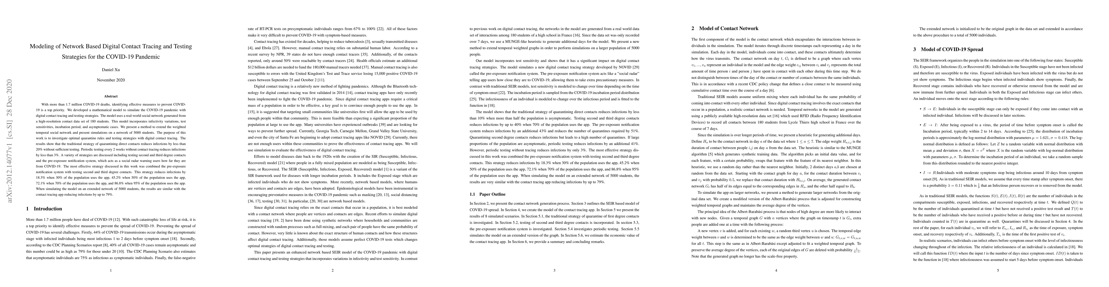 A mathematical model was developed using a real-world social network generated from high-resolution contact data of 180 students, incorporating infectivity variations, test sensitivities, incubation period, and asymptomatic cases.