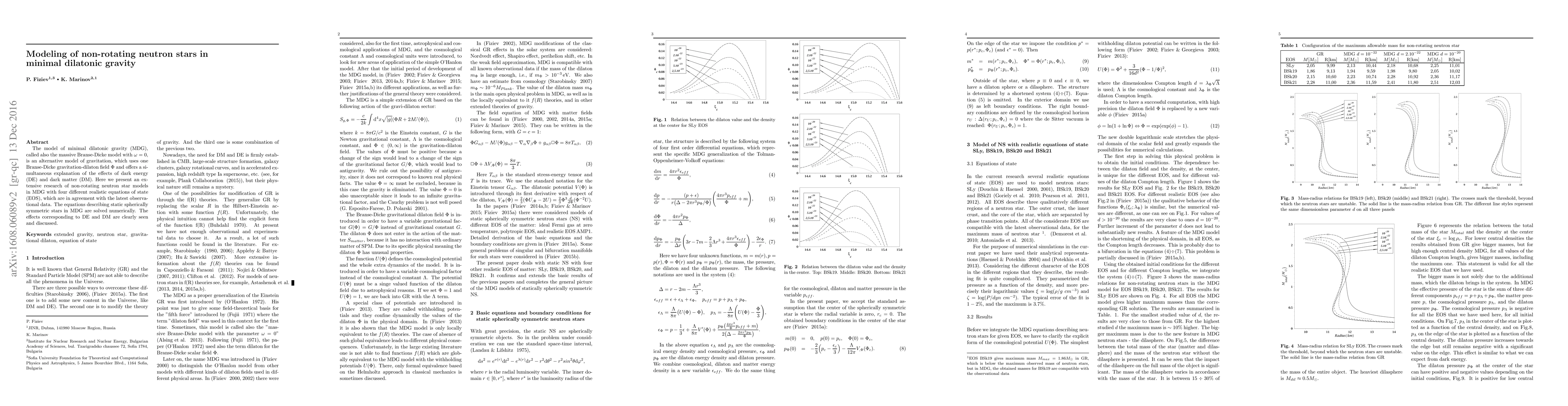 This paper explores non-rotating neutron star models within the framework of minimal dilatonic gravity (MDG), solving the equations numerically for four realistic equations of state. The study reveals distinct effects attributable to dark energy and dark matter, providing insights into alternative gravitational models.