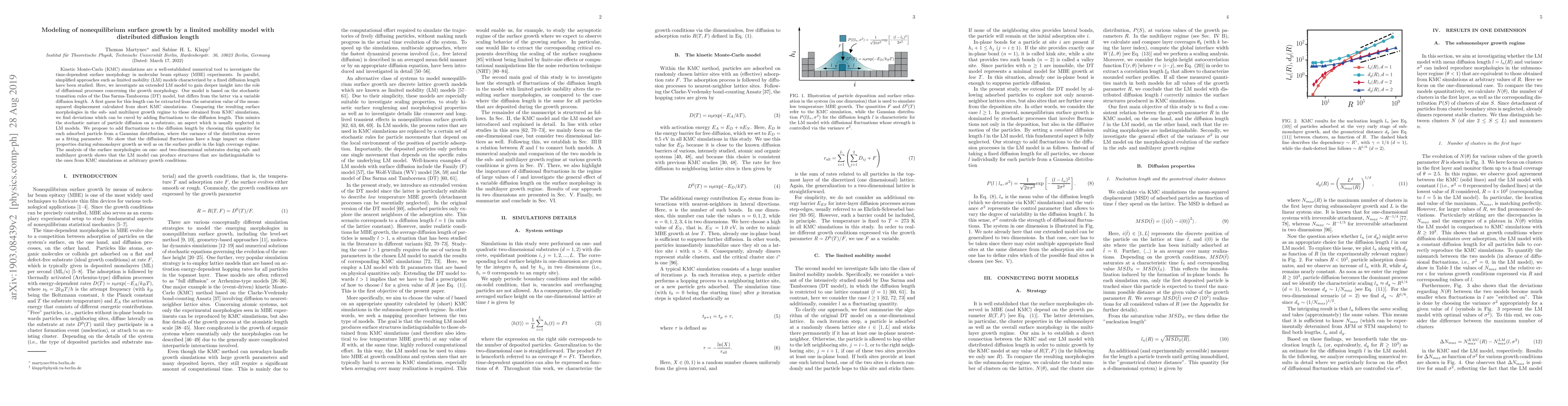 The research introduces an extended Limited Mobility (LM) model for nonequilibrium surface growth, treating the diffusion length as a variable parameter chosen from a Gaussian distribution for each deposited particle. The model's performance is tested by comparing LM and KMC results for cluster evolution during sub- and multilayer growth.