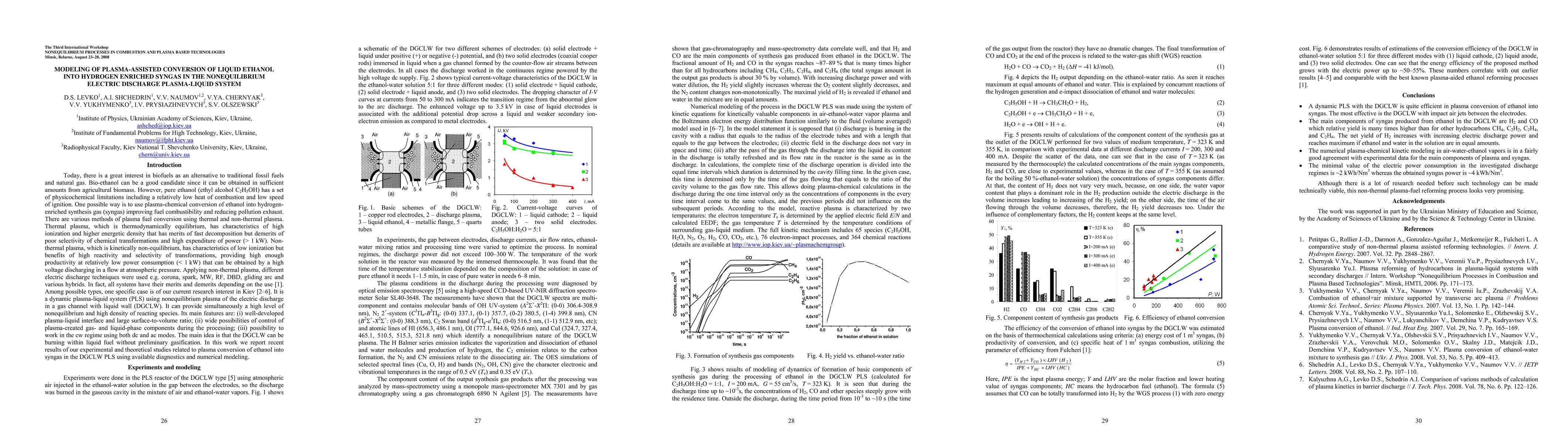 In this work we report recent results of our experimental and theoretical studies related to plasma conversion of liquid ethanol into hydrogen-enriched syngas in the plasma-liquid system with the electric discharge in a gas channel with liquid wall using available diagnostics and numerical modeling.