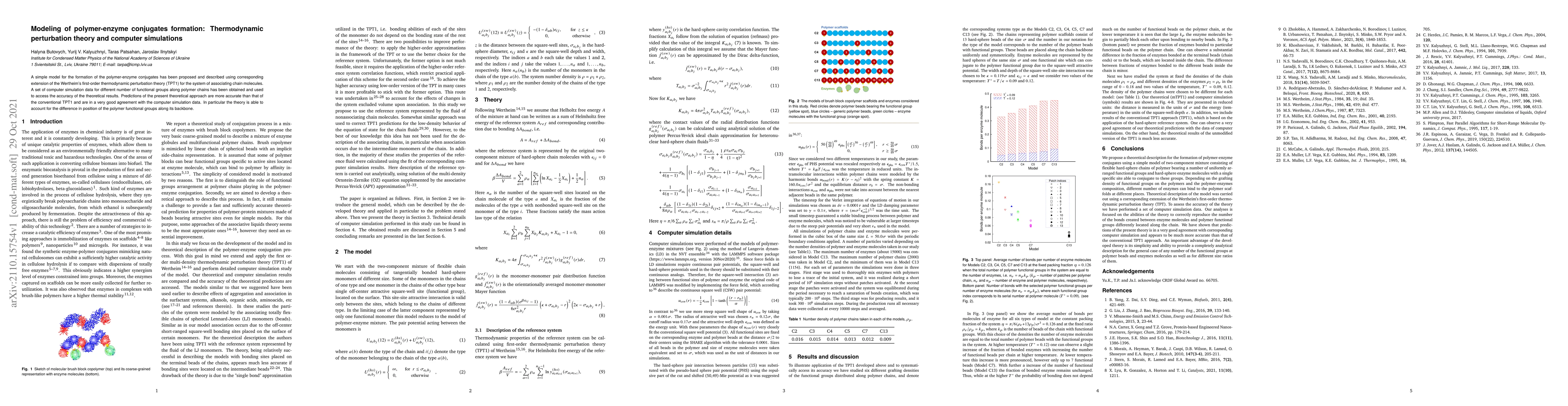 This research proposes a model for polymer-enzyme conjugate formation using an extended Wertheim's thermodynamic perturbation theory. Computer simulations validate this model, showing it's more accurate than conventional TPT1 and well-aligned with simulation data, particularly in accounting for functional group position along polymer chains.