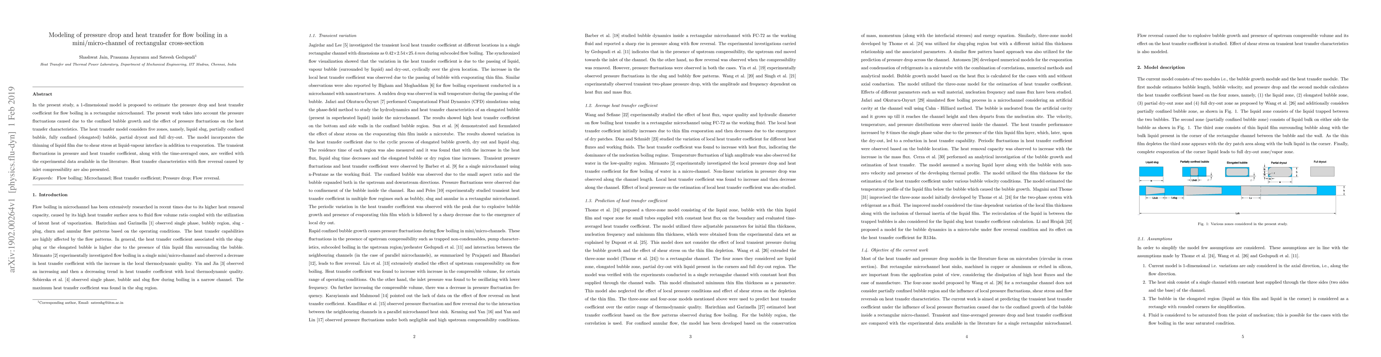 This study proposes a 1-dimensional model to estimate pressure drop and heat transfer in rectangular microchannels during flow boiling, considering pressure fluctuations and five distinct zones. The model's predictions are validated against experimental data and include transient effects and flow reversal impacts.