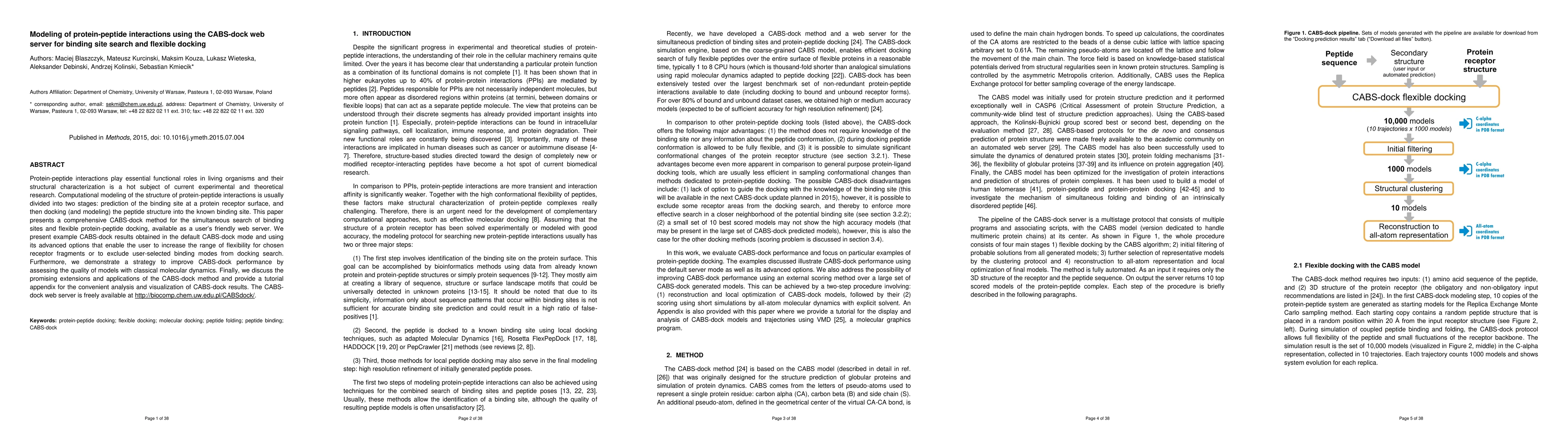 This paper introduces the CABS-dock web server for modeling protein-peptide interactions, enabling simultaneous binding site search and flexible docking. The method is demonstrated with examples and strategies for improving model quality, and the server is freely accessible for user convenience.