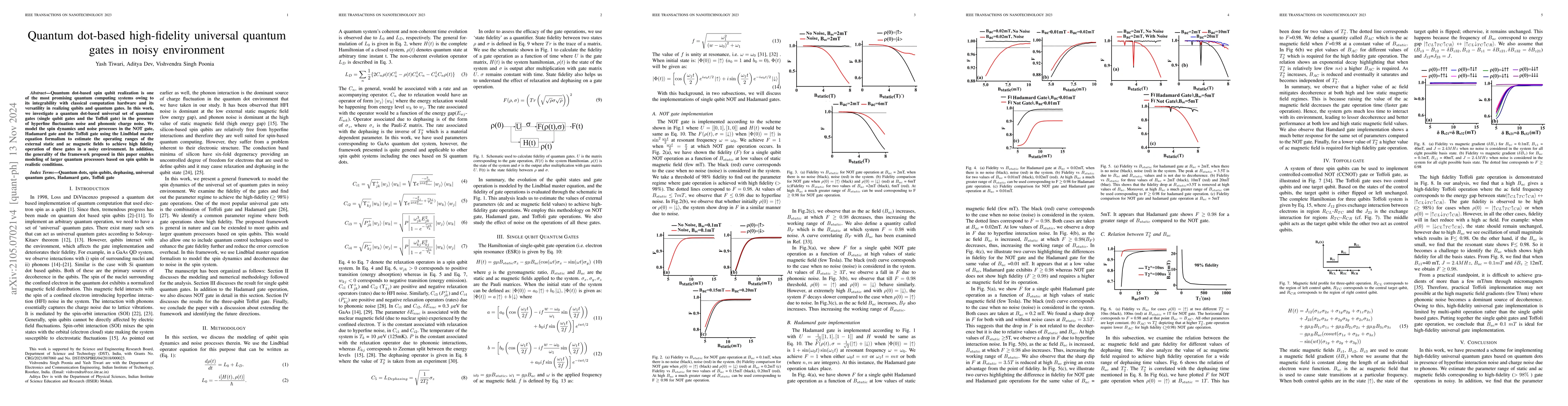 The paper presents a comprehensive model for quantum dot-based CNOT and Toffoli gates, incorporating noise from hyperfine interactions and phonons, and provides a method to estimate the operating range of external magnetic fields for high-fidelity gate operations.