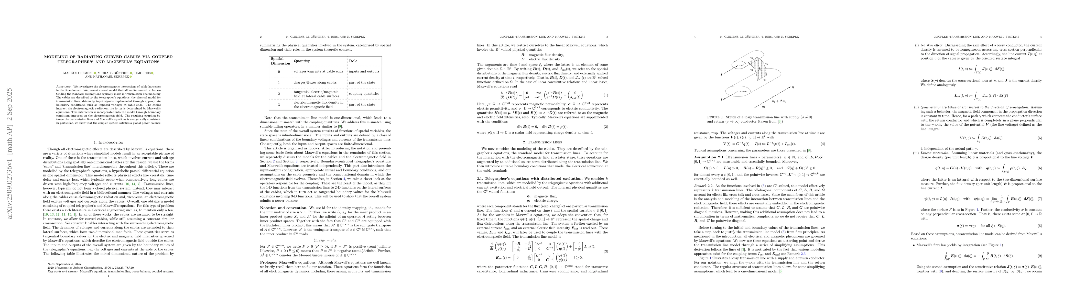 We investigate the electromagnetic interactions of cable harnesses in the time domain. We present a novel model that allows for curved cables, extending the standard assumptions typically made in transmission line modeling. The cables are described by the telegrapher's equations, the classical model for transmission lines, driven by input signals implemented through appropriate boundary conditions, such as imposed voltages at cable ends. The cables interact via electromagnetic radiation; the latter is determined by Maxwell's equations. This interaction is incorporated into the model through boundary conditions imposed on the electromagnetic field. The resulting coupling between the transmission lines and Maxwell's equations is energetically consistent. In particular, we show that the coupled system satisfies a global power balance.