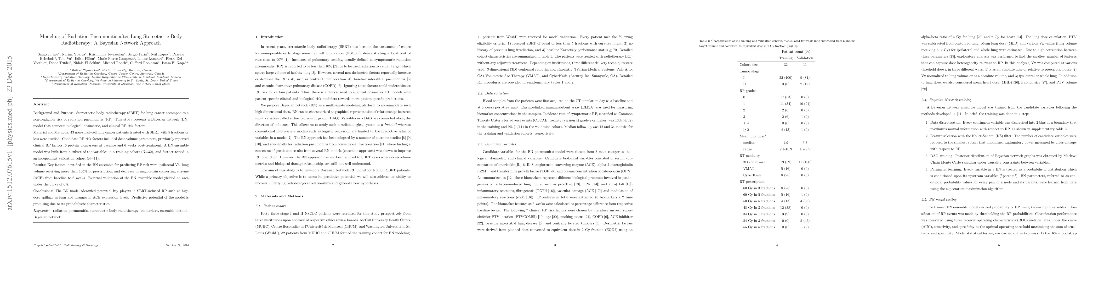 This study developed a Bayesian network model to predict radiation pneumonitis risk after lung stereotactic body radiotherapy, identifying key factors like high dose spillage and ACE expression changes. The model's predictive accuracy was validated with an area under the curve of 0.8, showing promising potential.
