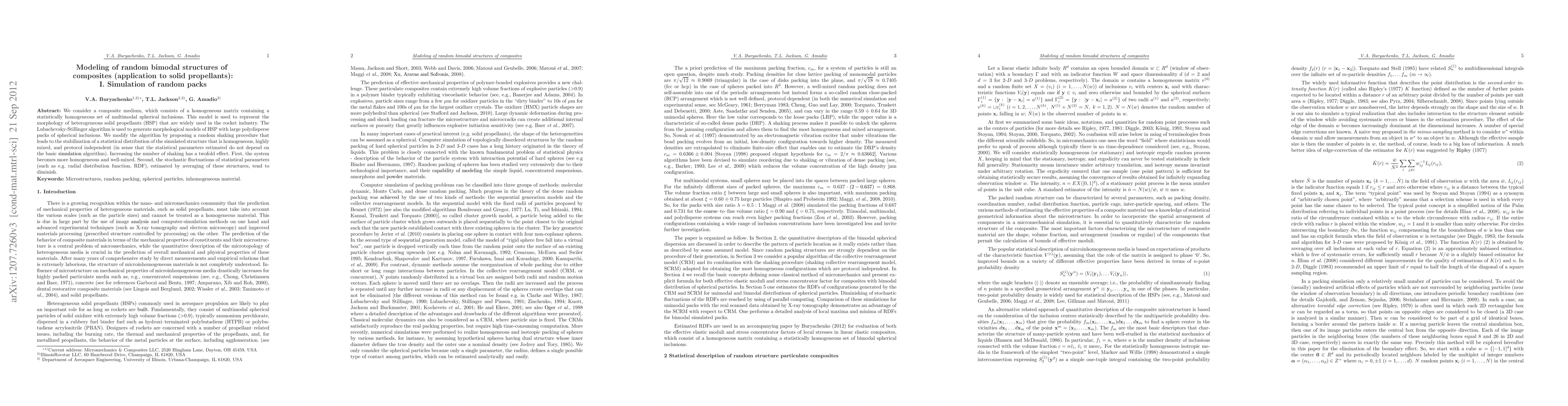 This research introduces a method to simulate random, bimodal structures of solid propellant composites using the Lubachevsky-Stillinger algorithm. A random shaking procedure stabilizes the statistical distribution, resulting in a homogeneous, well-mixed structure with reduced stochastic fluctuations in parameters like the radial distribution function. This approach has implications for modeling heterogeneous solid propellants in the rocket industry.
