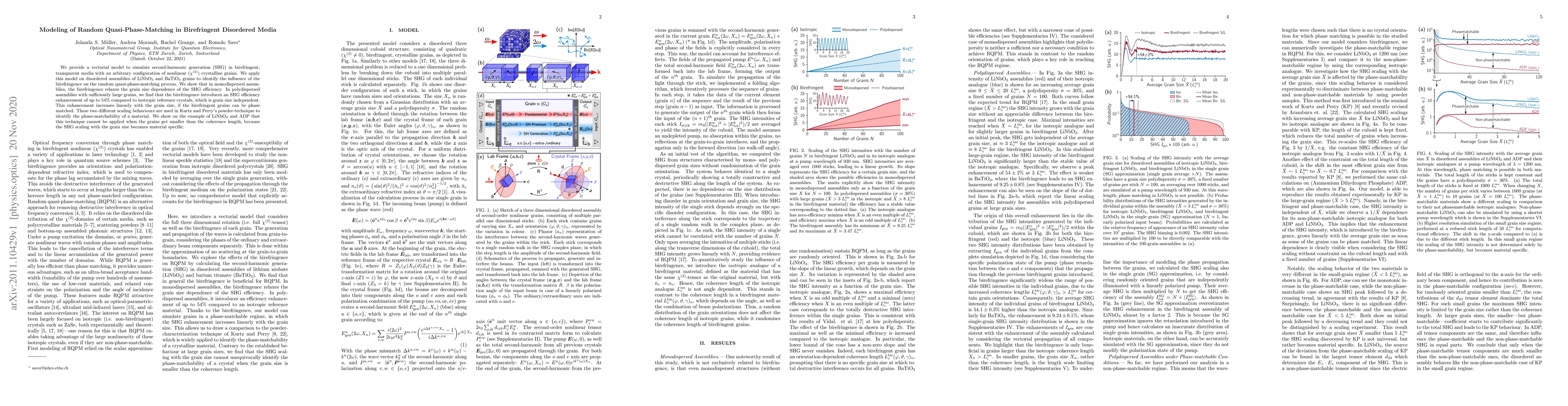 Researchers developed a model to simulate second-harmonic generation in birefringent disordered media, finding that birefringence enhances SHG efficiency up to 54% in large grains, but introduces limitations when grains get smaller than the coherence length.