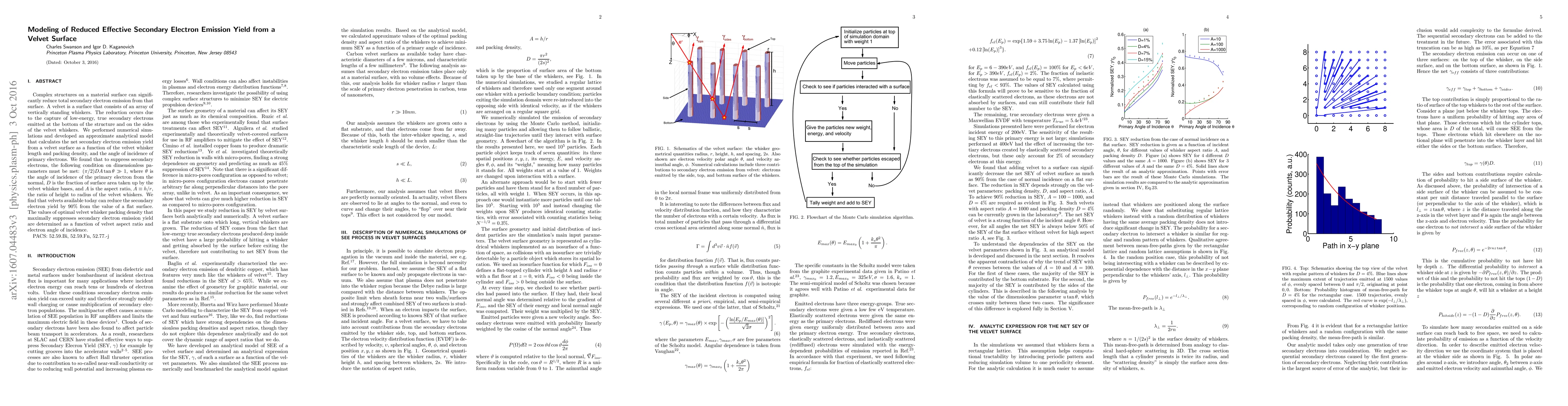 Complex structures on a material surface can significantly reduce total secondary electron emission from that surface. A velvet is a surface that consists of an array of vertically standing whiskers. The reduction occurs due to the capture of low-energy, true secondary electrons emitted at the bottom of the structure and on the sides of the velvet whiskers. We performed numerical simulations and developed an approximate analytical model that calculates the net secondary electron emission yield from a velvet surface as a function of the velvet whisker length and packing density, and the angle of incidence of primary electrons. We found that to suppress secondary electrons, the following condition on dimensionless parameters must be met: {\pi}/2 DA tan {\theta} >> 1 where {\theta} is the angle of incidence of the primary electron from the normal, D is the fraction of surface area taken up by the velvet whisker bases, and A is the aspect ratio, A {\equiv} h/r, the ratio of height to radius of the velvet whiskers. We find that velvets available today can reduce the secondary electron yield by 90% from the value of a flat surface. The values of optimal velvet whisker packing density that maximally suppresses secondary electron emission yield are determined as a function of velvet aspect ratio and electron angle of incidence.