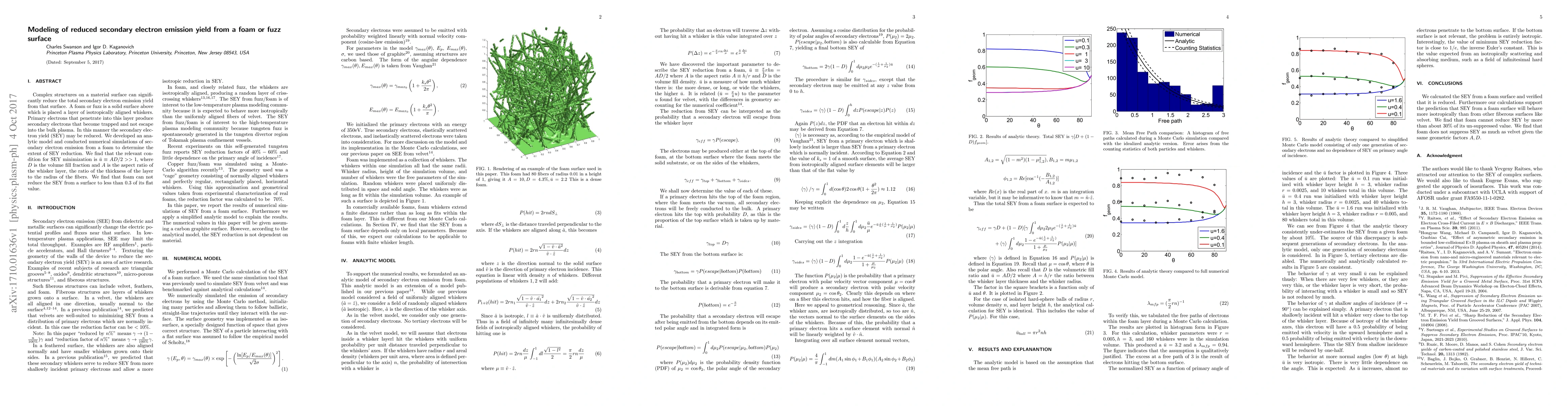 This research develops an analytic model and numerical simulations to study the reduced secondary electron emission yield from a foam or fuzz surface, finding that the SEY can be minimized when the aspect ratio of the whisker layer is significantly greater than 1. The study concludes that the SEY cannot drop below 0.3 of its flat surface value.