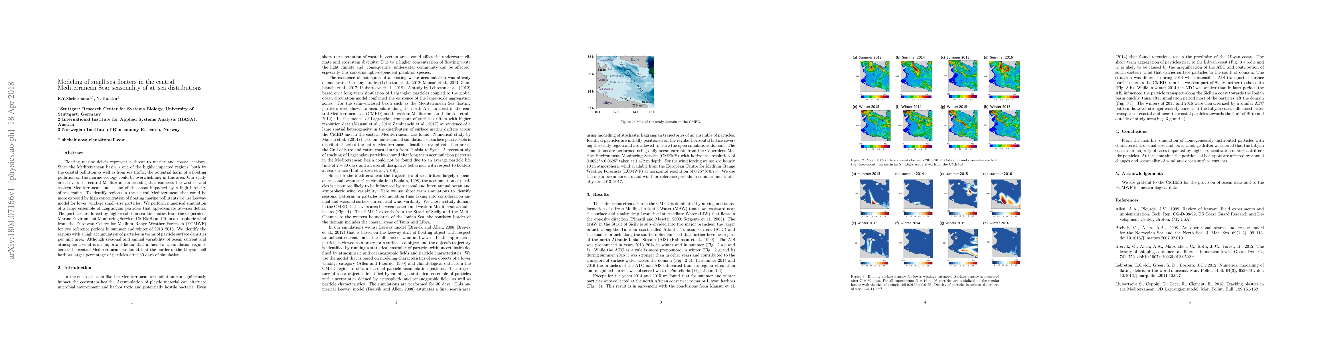 This study models the seasonal distribution of small sea floaters in the central Mediterranean Sea using a Leeway model, simulating Lagrangian particles to represent floating marine debris. The research identifies regions with high accumulation of particles, finding that the Libyan shelf border retains a larger percentage of particles after 30 days, highlighting seasonal influences on debris distribution.