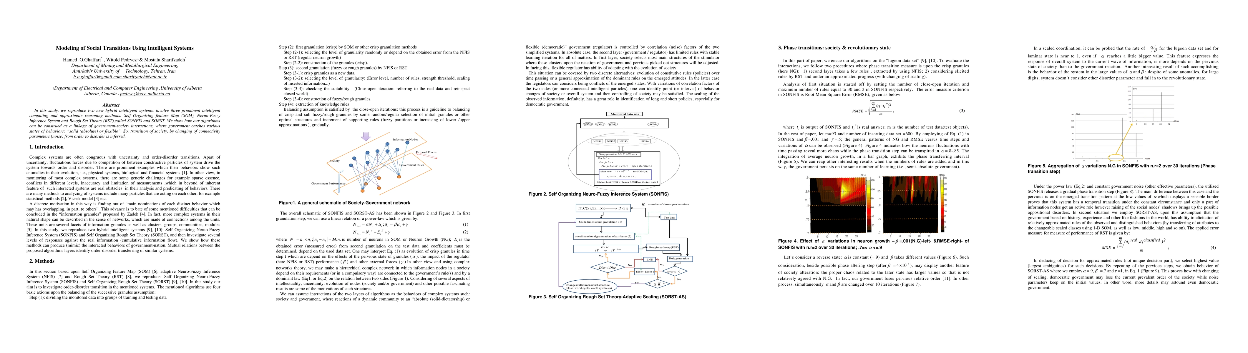 This study develops two hybrid intelligent systems, SONFIS and SORST, combining Self Organizing feature Map, Neuro-Fuzzy Inference System, and Rough Set Theory to model social transitions. The algorithms simulate government-society interactions, inferring societal shifts from order to disorder through changes in connectivity parameters.