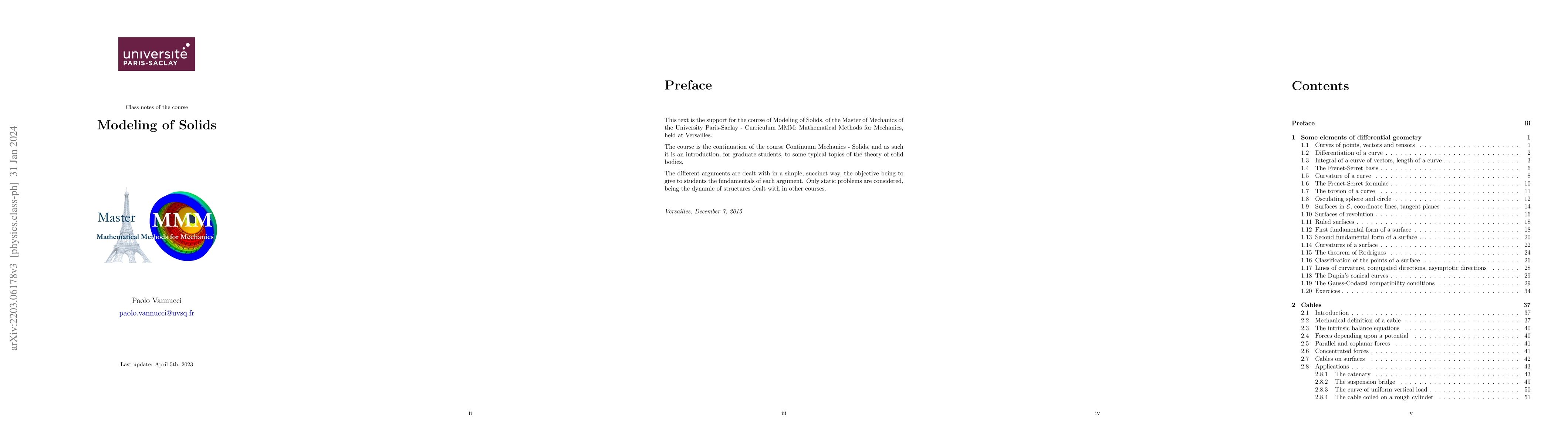 This course on Modeling of Solids for the Master of Mechanics at University Paris-Saclay introduces graduate students to fundamental topics in solid body theory, focusing on static problems and building on the Continuum Mechanics - Solids course. The aim is to provide students with concise, foundational knowledge in each topic.