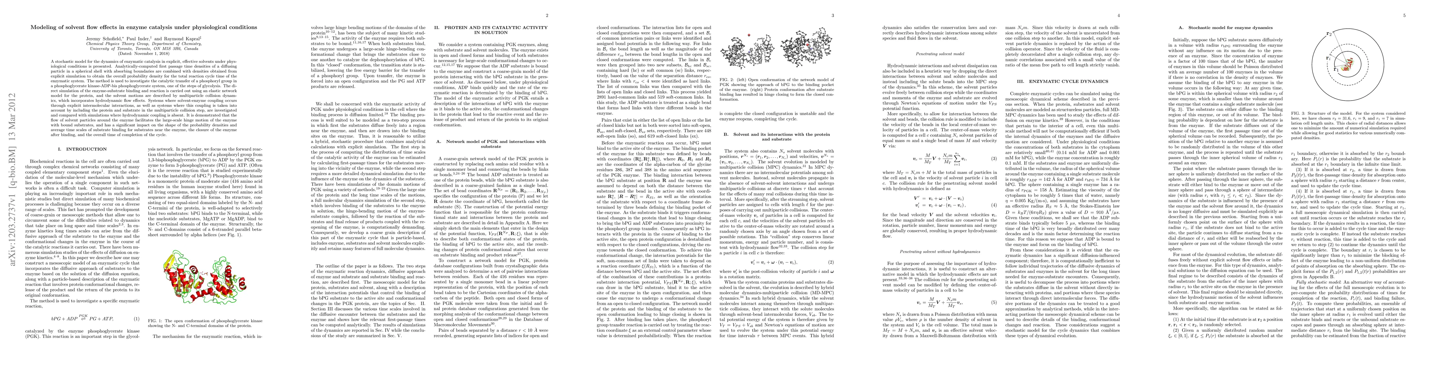 This paper presents a stochastic model to analyze enzymatic catalysis dynamics under physiological conditions, combining analytical and simulation methods to study solvent flow effects. It shows that solvent flow significantly influences enzyme motion and reaction times in the phosphoglycerate kinase-ADP-bis phosphoglycerate system, highlighting the importance of hydrodynamic coupling in enzymatic processes.