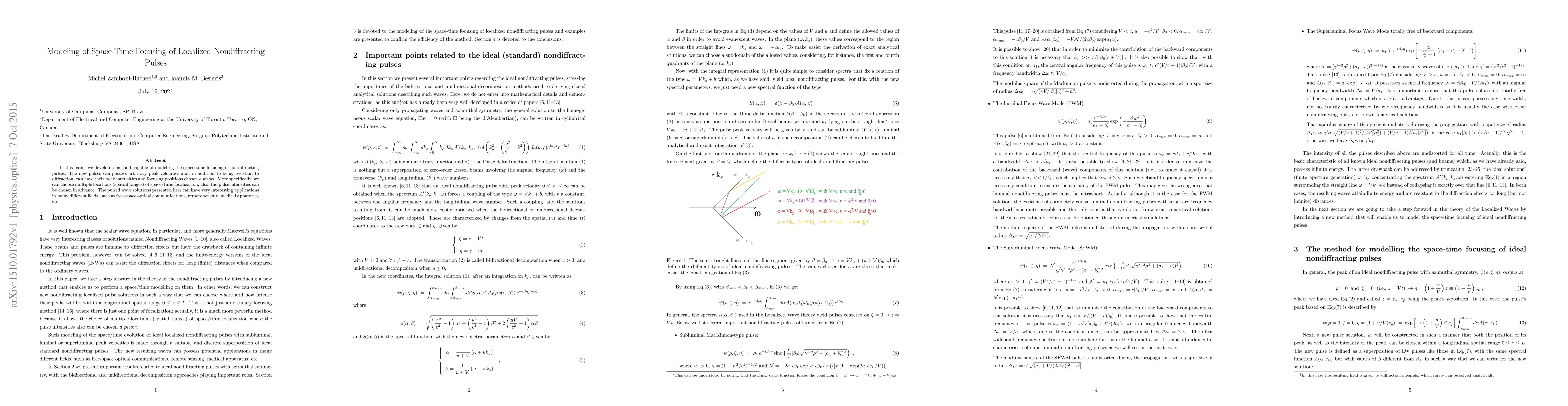 This paper introduces a method to model space-time focusing of nondiffracting pulses with customizable peak velocities, intensities, and focalization positions. These versatile pulses have potential applications in fields like optical communications, remote sensing, and medical technology.