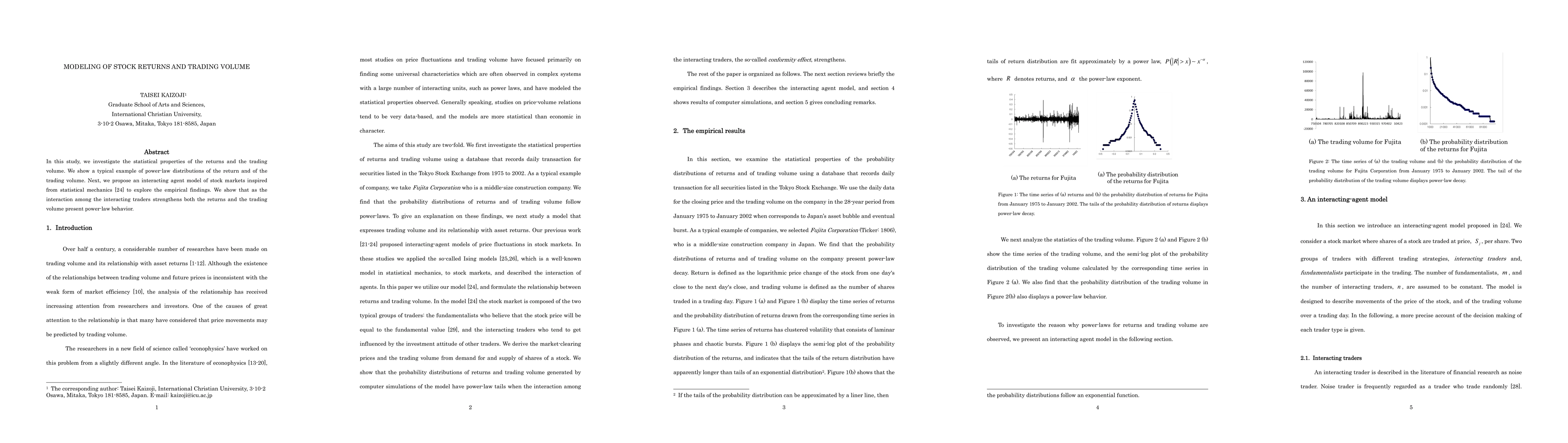 This study investigates the statistical properties of stock returns and trading volume, revealing power-law distributions. It proposes an interacting agent model inspired by statistical mechanics, demonstrating that stronger trader interactions lead to power-law behavior in both returns and trading volume.