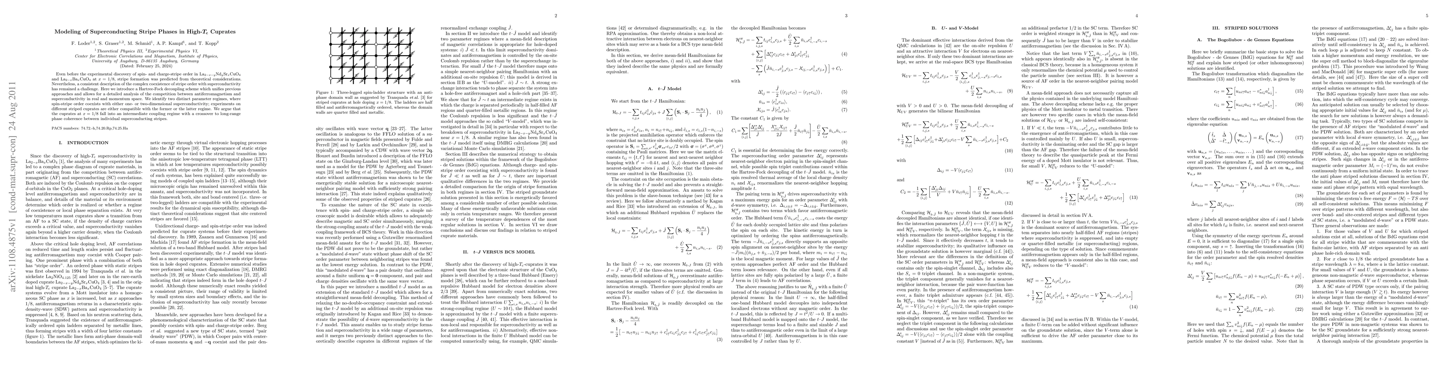 This paper introduces a Hartree-Fock decoupling scheme to model the superconducting stripe phases in high-Tc cuprates, revealing two distinct regimes where spin-stripe order coexists with either one- or two-dimensional superconductivity. The study suggests that cuprates at x = 1/8 exhibit an intermediate coupling regime with a transition to long-range coherence between superconducting stripes.