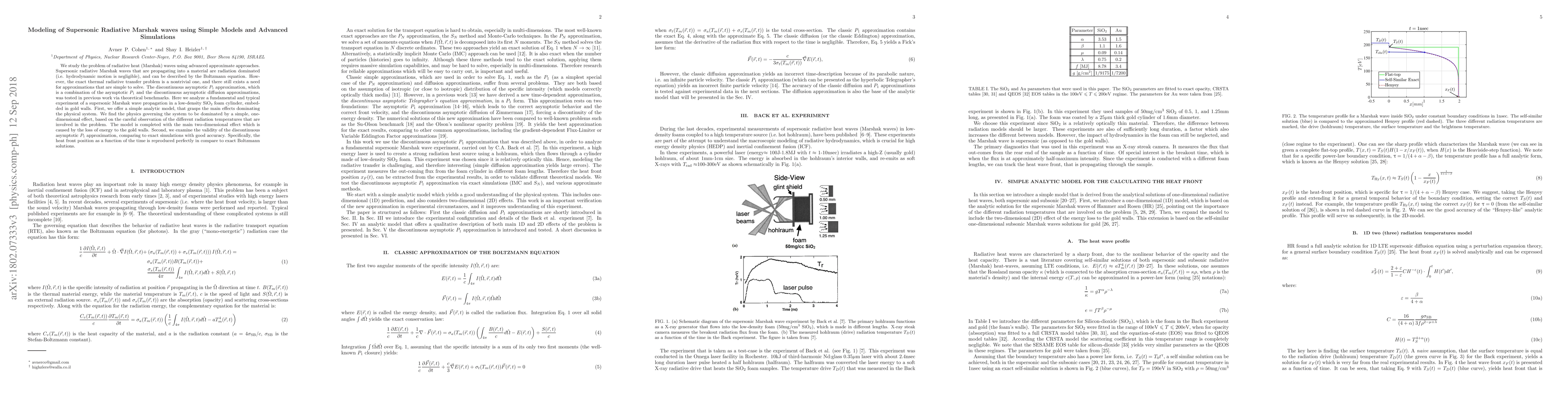 We study the problem of radiative heat (Marshak) waves using advanced approximate approaches. Supersonic radiative Marshak waves that are propagating into a material are radiation dominated (i.e. hydrodynamic motion is negligible), and can be described by the Boltzmann equation. However, the exact thermal radiative transfer problem is a nontrivial one, and there still exists a need for approximations that are simple to solve. The discontinuous asymptotic $P_1$ approximation, which is a combination of the asymptotic $P_1$ and the discontinuous asymptotic diffusion approximations, was tested in previous work via theoretical benchmarks. Here we analyze a fundamental and typical experiment of a supersonic Marshak wave propagation in a low-density $\mathrm{SiO_2}$ foam cylinder, embedded in gold walls. First, we offer a simple analytic model, that grasps the main effects dominating the physical system. We find the physics governing the system to be dominated by a simple, one-dimensional effect, based on the careful observation of the different radiation temperatures that are involved in the problem. The model is completed with the main two-dimensional effect which is caused by the loss of energy to the gold walls. Second, we examine the validity of the discontinuous asymptotic $P_1$ approximation, comparing to exact simulations with good accuracy. Specifically, the heat front position as a function of the time is reproduced perfectly in compare to exact Boltzmann solutions.
