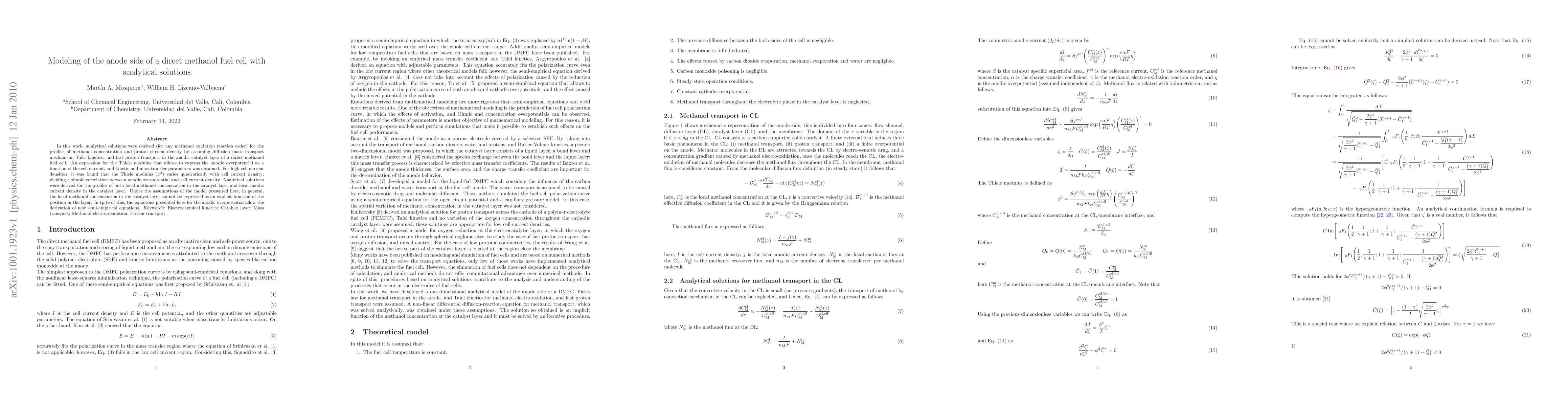 This paper derives analytical solutions for methanol concentration and proton current density profiles in the anodic catalyst layer of a direct methanol fuel cell, considering diffusion mass transport, Tafel kinetics, and fast proton transport. The study establishes a quadratic relationship between the Thiele modulus and cell current density, facilitating a simple correlation for anodic overpotential.