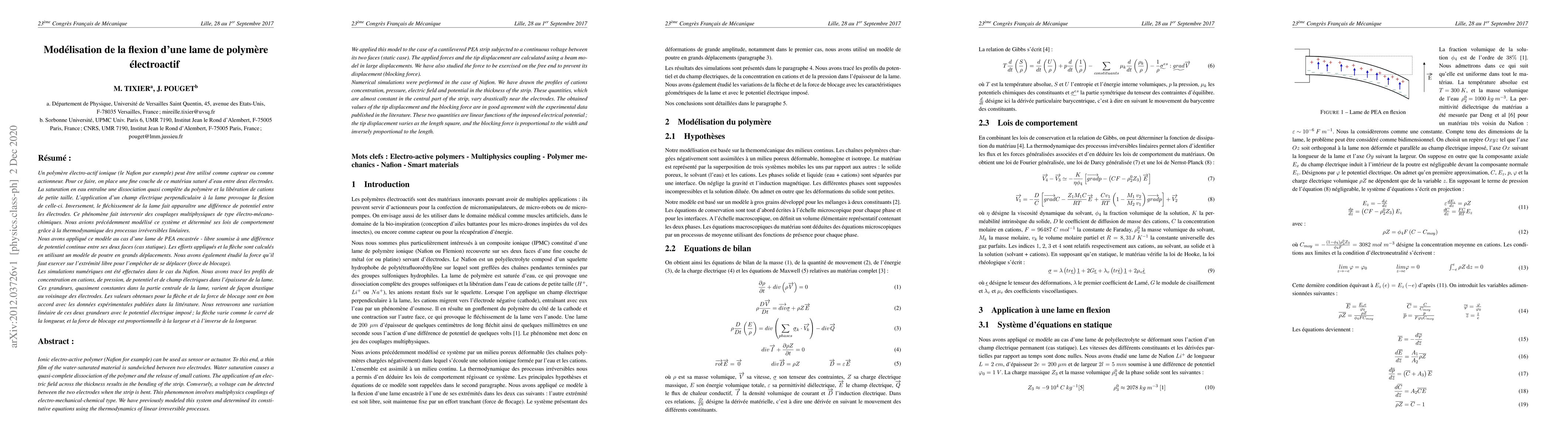 Ionic electro-active polymer (Nafion for example) can be used as sensor or actuator. To this end, a thin film of the water-saturated material is sandwiched between two electrodes. Water saturation causes a quasi-complete dissociation of the polymer and the release of small cations. The application of an electric field across the thickness results in the bending of the strip. Conversely, a voltage can be detected between the two electrodes when the strip is bent. This phenomenon involves multiphysics couplings of electro-mechanical-chemical type. We have previously modeled this system and determined its constitutive equations using the thermodynamics of linear irreversible processes.We applied this model to the case of a cantilevered PEA strip subjected to a continuous voltage between its two faces (static case). The applied forces and the tip displacement are calculated using a beam model in large displacements. We have also studied the force to be exercised on the free end to prevent its displacement (blocking force).Numerical simulations were performed in the case of Nafion. We have drawn the profiles of cations concentration, pressure, electric field and potential in the thickness of the strip. These quantities, which are almost constant in the central part of the strip, vary drastically near the electrodes. The obtained values of the tip displacement and the blocking force are in good agreement with the experimental data published in the literature. These two quantities are linear functions of the imposed electrical potential ; the tip displacement varies as the length square, and the blocking force is proportional to the width and inversely proportional to the length.