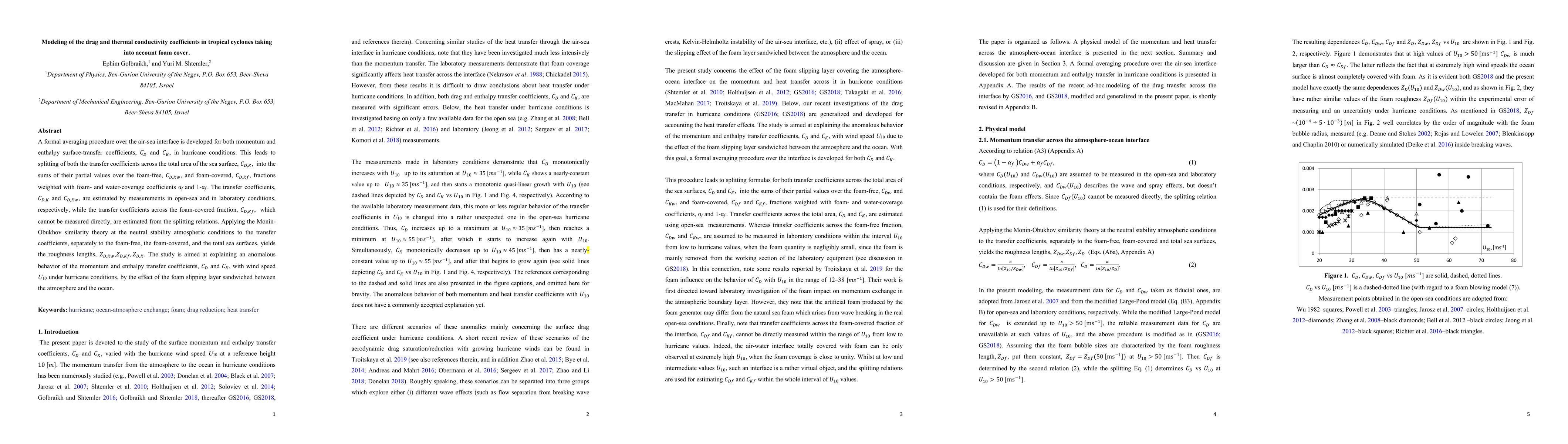 This paper develops a formal averaging method to estimate drag and thermal conductivity coefficients in tropical cyclones, accounting for the influence of foam cover on the air-sea interface. It splits these coefficients into foam-free and foam-covered components, estimating the latter indirectly, and uses Monin-Obukhov similarity theory to explain anomalous transfer behaviors under hurricane conditions.