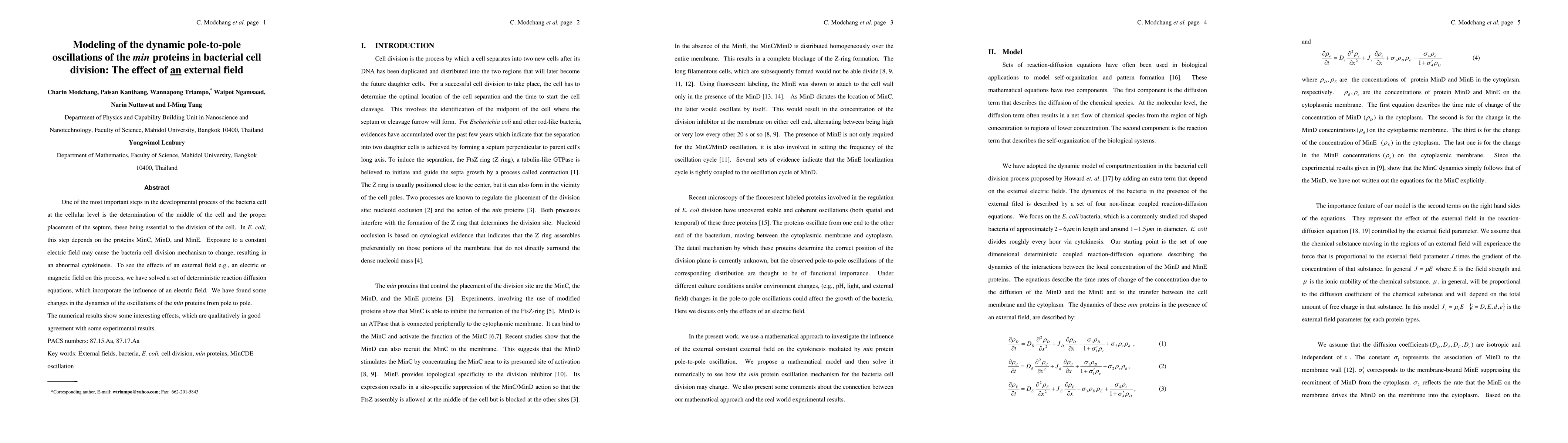 One of the most important steps in the developmental process of the bacteria cell at the cellular level is the determination of the middle of the cell and the proper placement of the septum, these being essential to the division of the cell. In E. coli, this step depends on the proteins MinC, MinD, and MinE. Exposure to a constant electric field may cause the bacteria cell division mechanism to change, resulting in an abnormal cytokinesis. To see the effects of an external field e.g., an electric or magnetic field on this process, we have solved a set of deterministic reaction diffusion equations, which incorporate the influence of an electric field. We have found some changes in the dynamics of the oscillations of the min proteins from pole to pole. The numerical results show some interesting effects, which are qualitatively in good agreement with some experimental results.