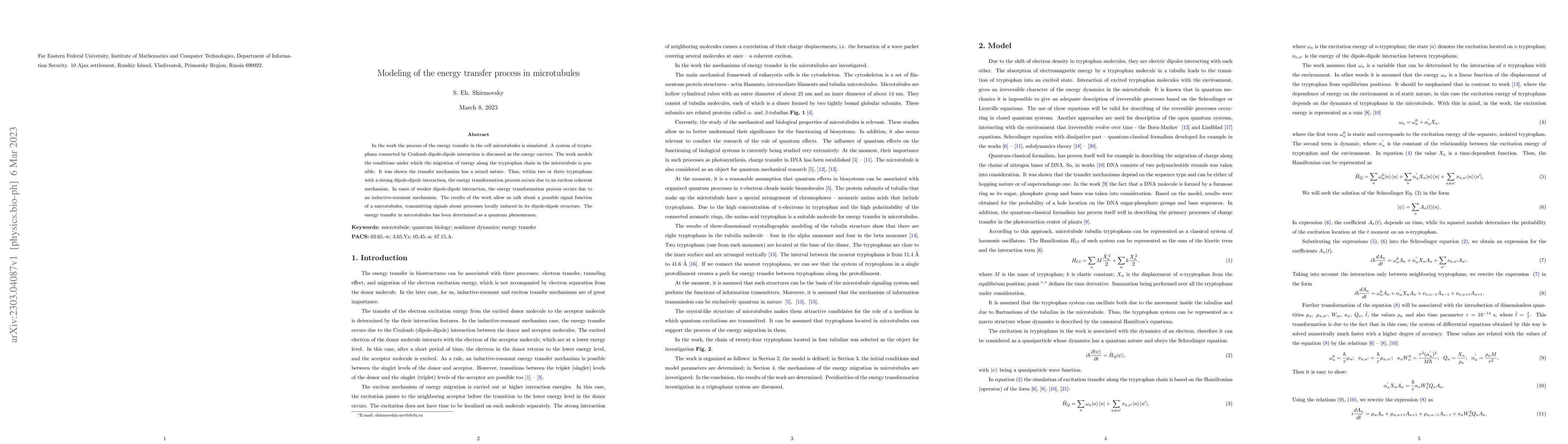 In the work the process of the energy transfer in the cell microtubules is simulated. A system of tryptophans connected by Coulomb dipole-dipole interaction is discussed as the energy carriers. The work models the conditions under which the migration of energy along the tryptophan chain in the microtubule is possible. It was shown the transfer mechanism has a mixed nature. Thus, within two or three tryptophans with a strong dipole-dipole interaction, the energy transformation process occurs due to an exciton coherent mechanism. In cases of weaker dipole-dipole interaction, the energy transformation process occurs due to an inductive-resonant mechanism. The results of the work allow us talk about a possible signal function of a microtubules, transmitting signals about processes locally induced in its dipole-dipole structure. The energy transfer in microtubules has been determined as a quantum phenomenon.