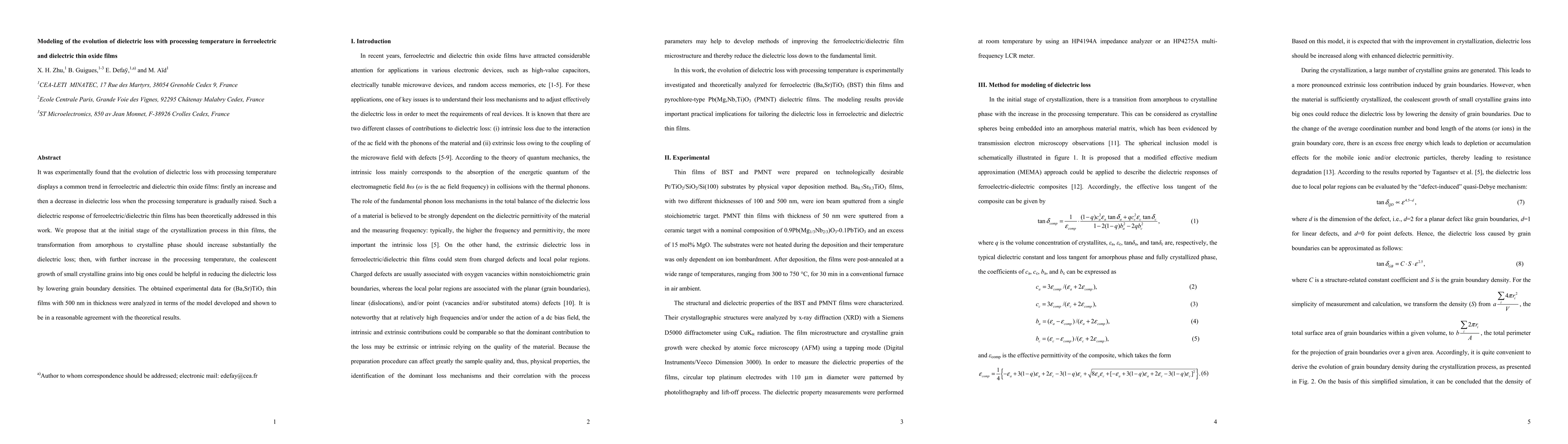 This paper investigates the evolution of dielectric loss in ferroelectric and dielectric thin oxide films with processing temperature, finding a trend of initial increase followed by a decrease. The study proposes that the initial rise in dielectric loss is due to the transformation from amorphous to crystalline phase, while subsequent reduction is attributed to the coalescence of crystalline grains, reducing grain boundary densities. Experimental data for (Ba,Sr)TiO3 thin films supports the developed theoretical model.