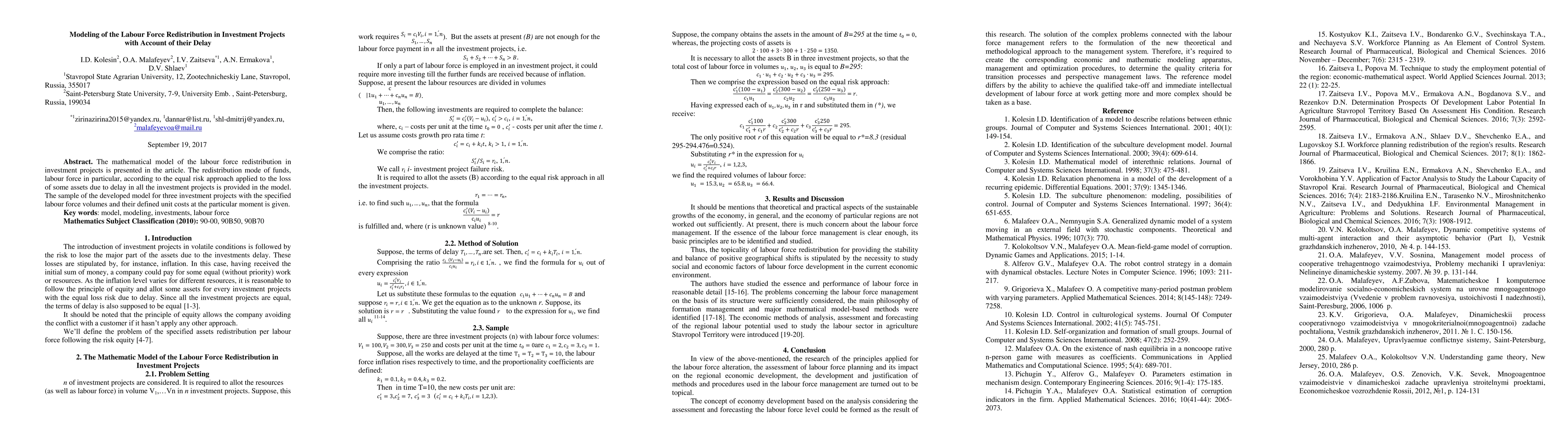The mathematical model of the labour force redistribution in investment projects is presented in the article. The redistribution mode of funds, labour force in particular, according to the equal risk approach applied to the loss of some assets due to delay in all the investment projects is provided in the model. The sample of the developed model for three investment projects with the specified labour force volumes and their defined unit costs at the particular moment is given.