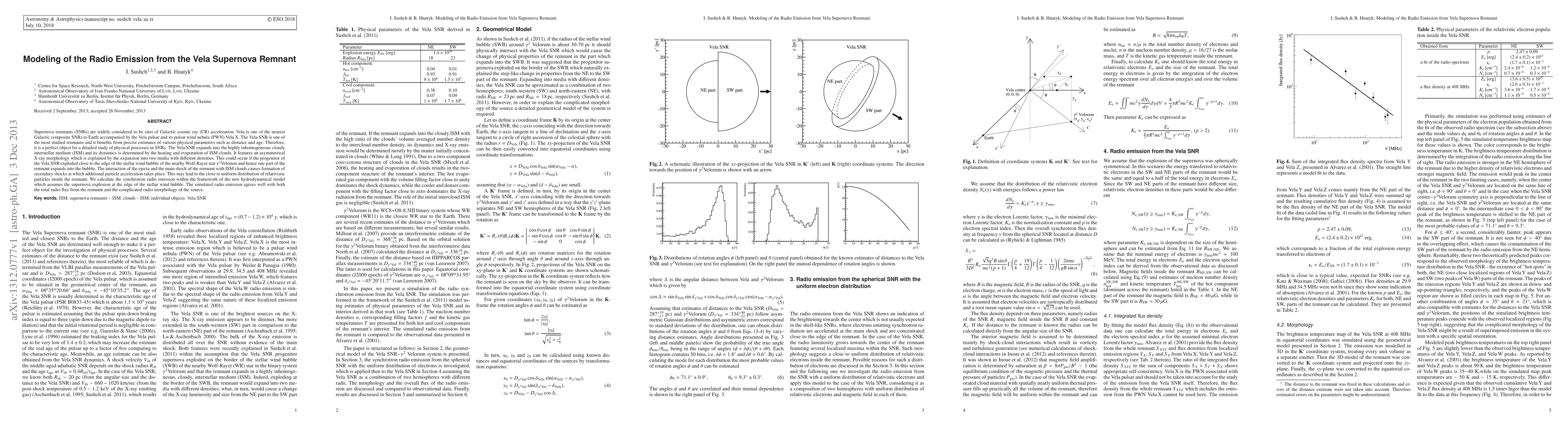 This paper models the radio emission from the Vela supernova remnant, focusing on its interaction with the interstellar medium and the acceleration of cosmic rays. The study uses a new hydrodynamical model to simulate the synchrotron radio emission, which aligns well with observed radio flux and morphology.